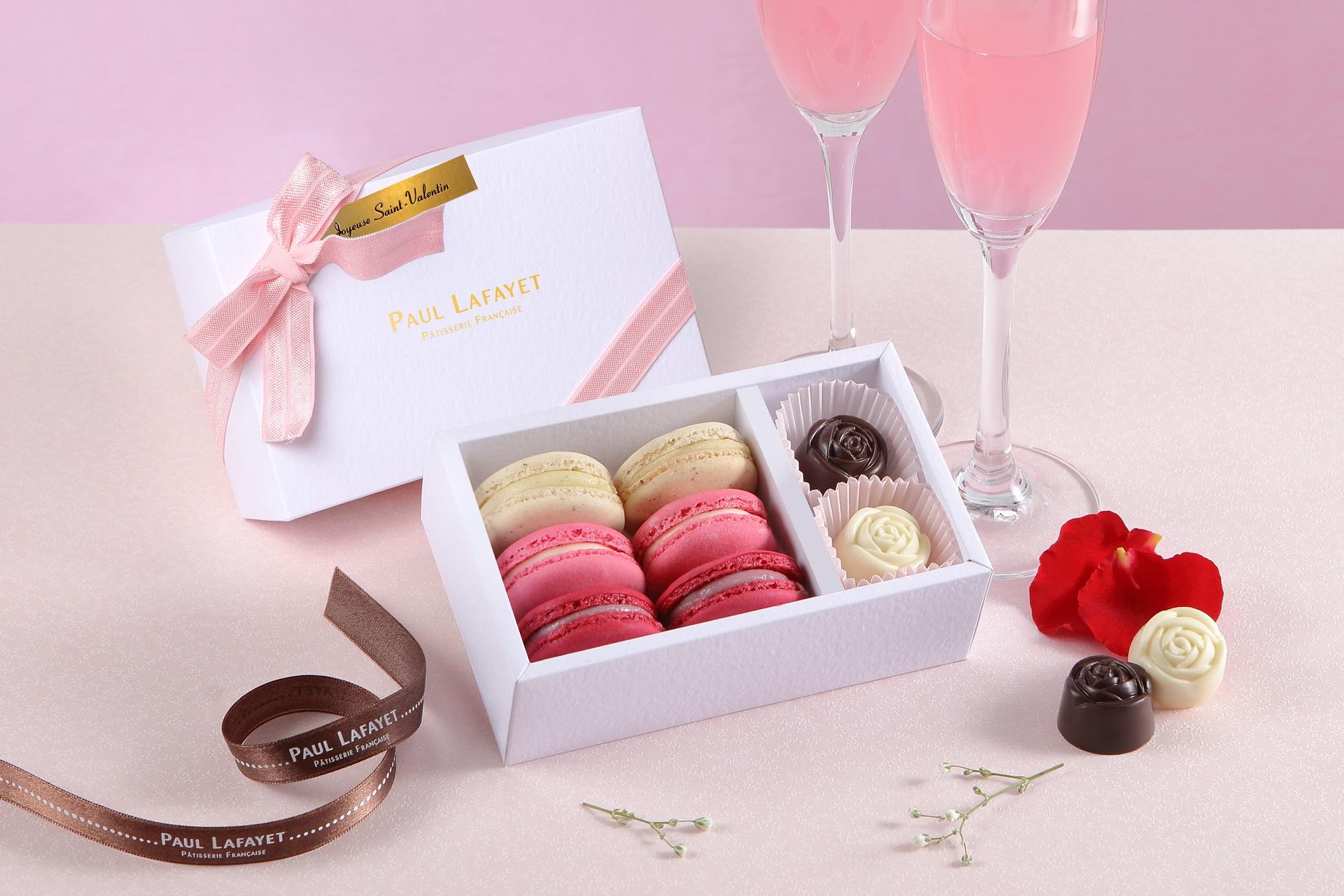 Paul Lafayet的”Journée Romantique”限量版情人節禮盒,以滿載甜蜜的粉色馬卡龍(雲呢拿、紅莓及玫瑰口味各兩粒),以及兩款玫瑰花造型朱古力 (杏仁白朱古力及黑朱古力71%) 組成。以這個禮盒,將情人節的甜蜜和愛意,用法式經典甜點來表達,送贈喜歡的人。