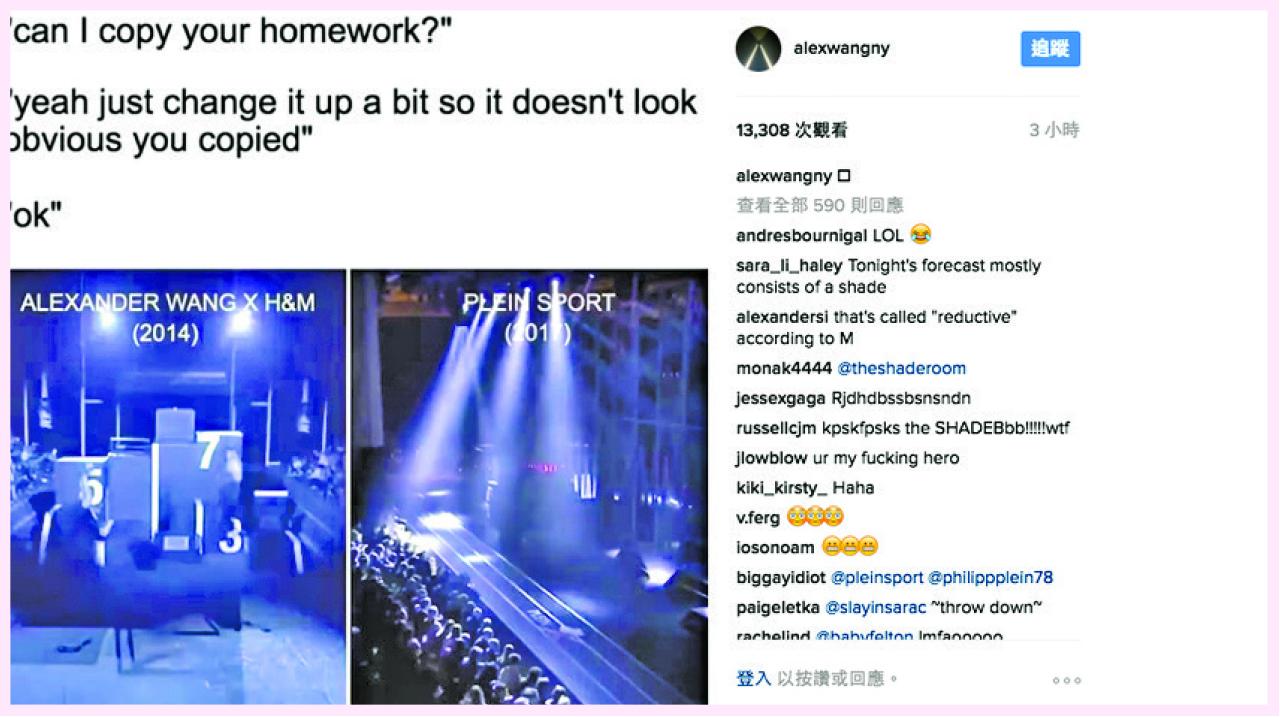 美籍華裔設計師Alexander Wang(王大仁)在個人Instagram上載短片,直指剛在1月發表的人氣設計師Philipp Plein 2017運動系列,完全是抄襲他在2014年與H&M的設計。