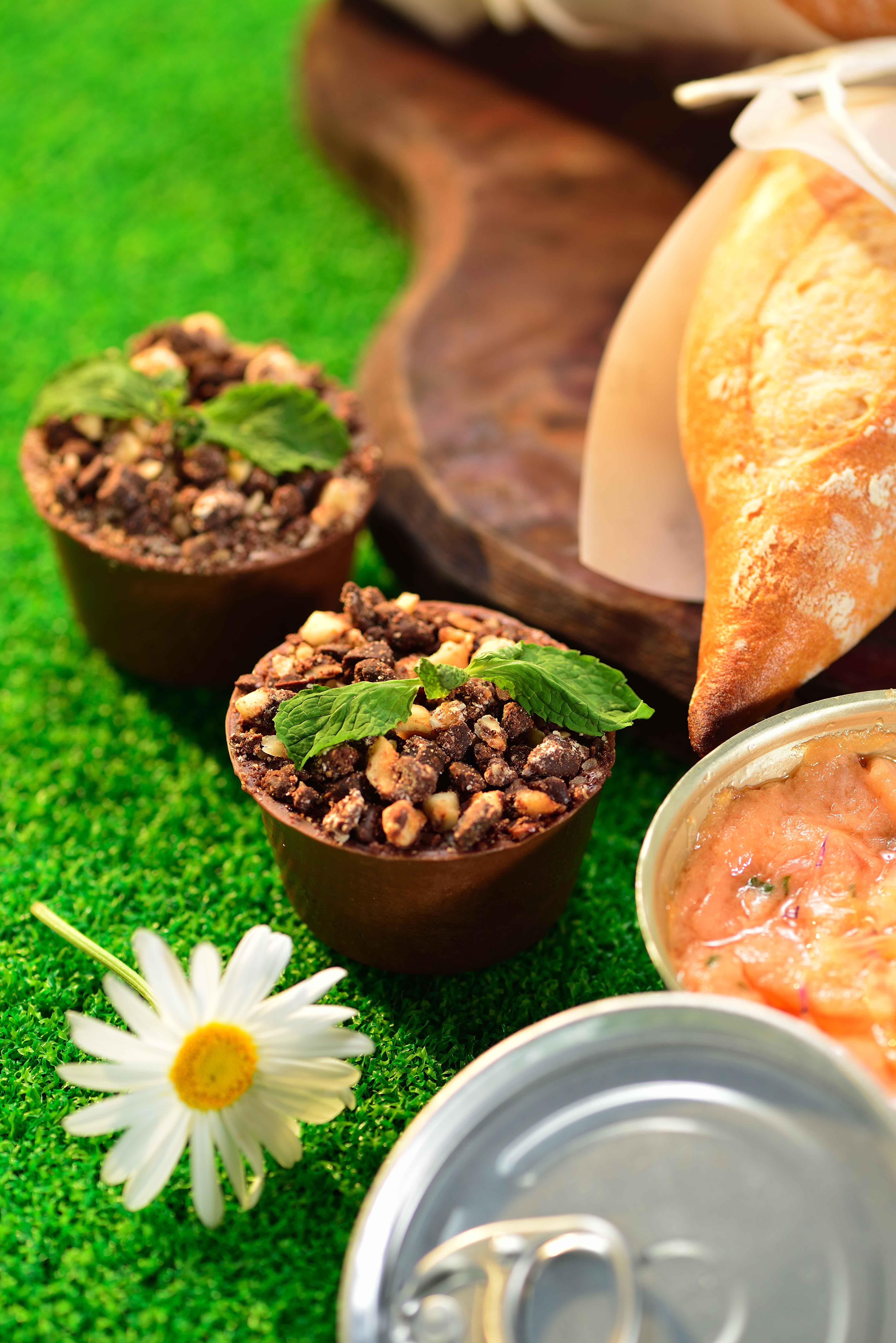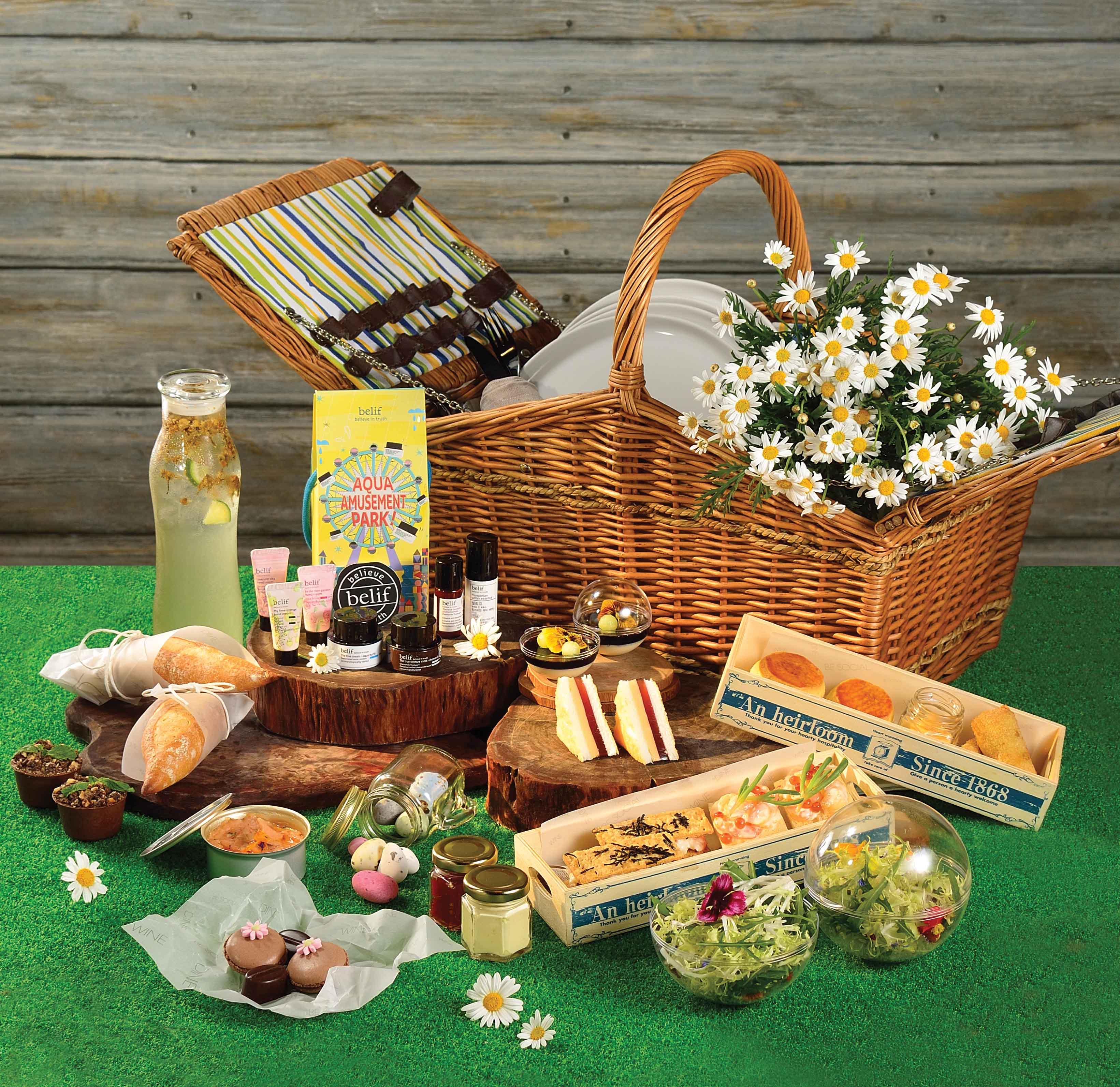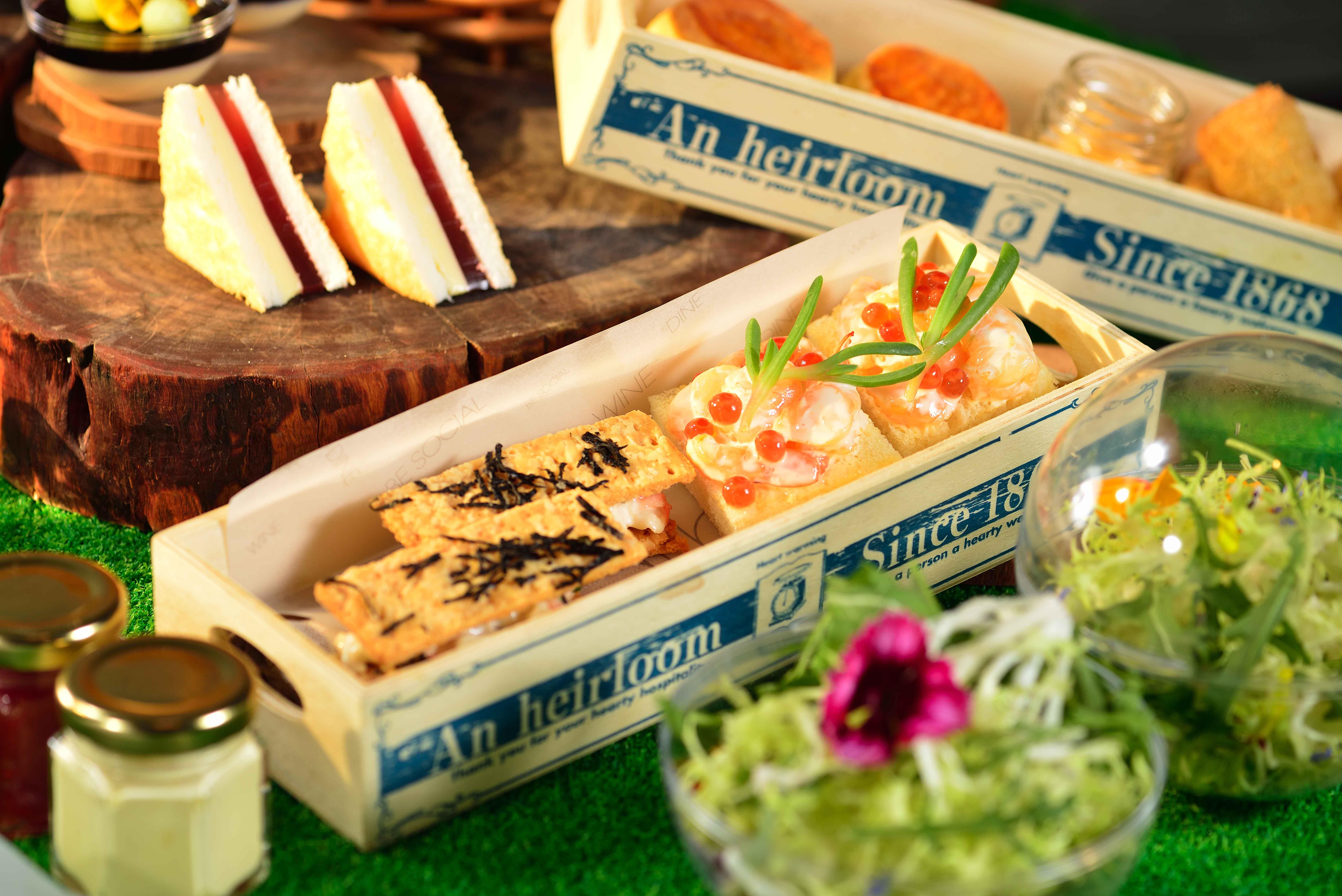 野餐籃內有十多款別具心思的甜鹹茶點,鹹點包括煙燻洋甘菊三文魚配法包、皇帝蟹肉配紫菜酥皮及海膽鮮蝦三文治等,外型美輪美奐。