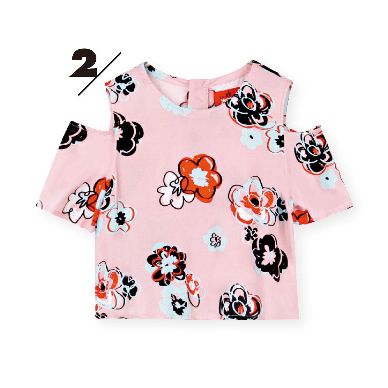 2. 粉紅配手繪筆法的花花圖案露肩上衣,配長傘裙子,散發著一份少女的情懷。($899,b+ab)