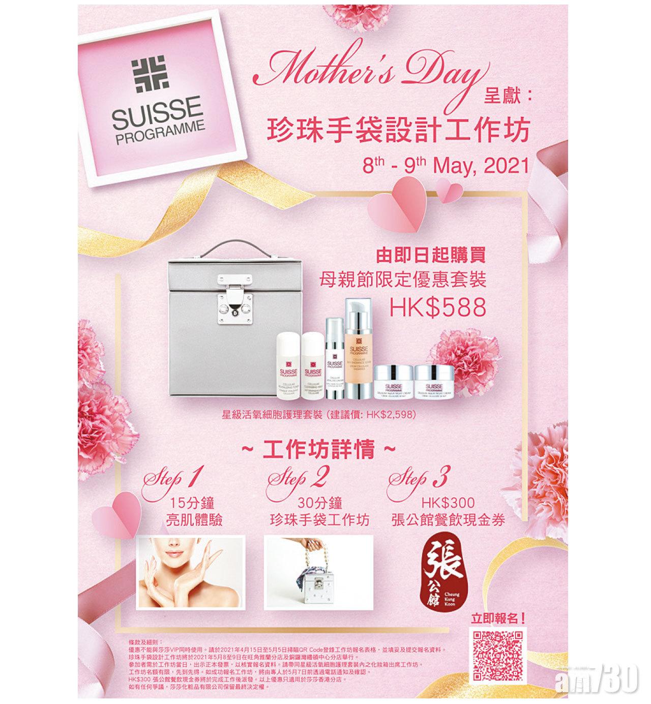 瑞士激活細胞專家SUISSE PROGRAMME,特別推出「Mother’s Day 珍珠手袋設計工作坊」,由即日起至本月5日,顧客不但可以母親節限定優惠價$588,購買星級活氧細胞護理套裝 (價值:$2,598),更可參加30分鐘珍珠手袋設計工作坊、15分鐘亮肌體驗,以及獲得張公館價值300的餐飲現金券。名額有限,先到先得。(銅鑼灣禮頓道77號禮頓中心地下及2樓,莎莎)