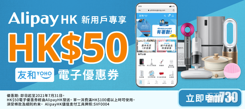 利用AlipayHK使用電子消費券,友和YOHO精選產品低至26折。