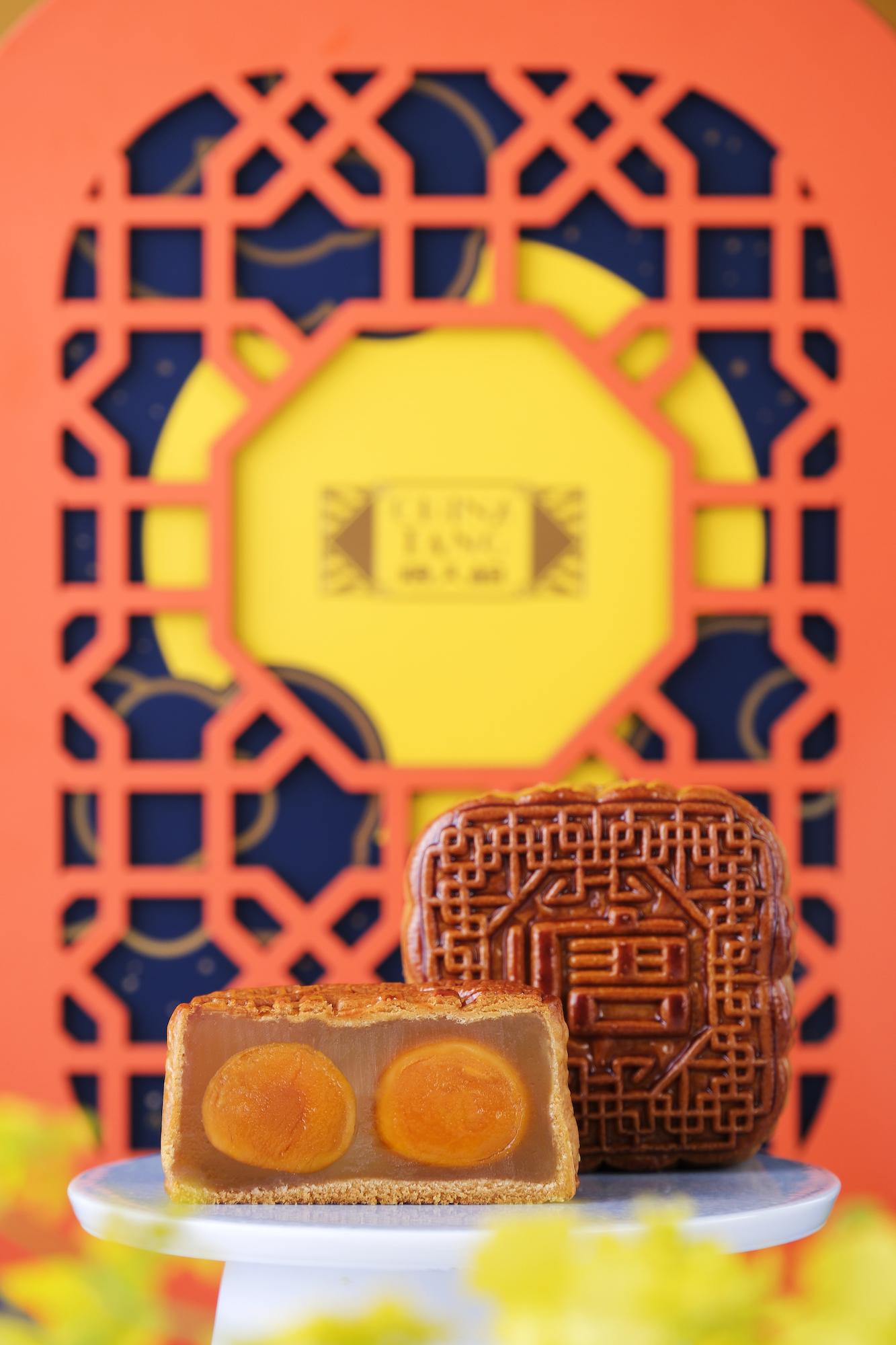 一盒4個,其琥珀橘盒映徹燈輝,復古風采猶存,配以雕鏤剔透的窗框,宛如隙見星辰燁燁,皎潔明暉灑落。選用傳統配方及上等材料炮製,以頂級蓮子製成細滑白蓮蓉,配上原個金香鹹蛋黃以及純正花生油,傳統工藝烘焙,入口甘香軟滑,清甜不膩。