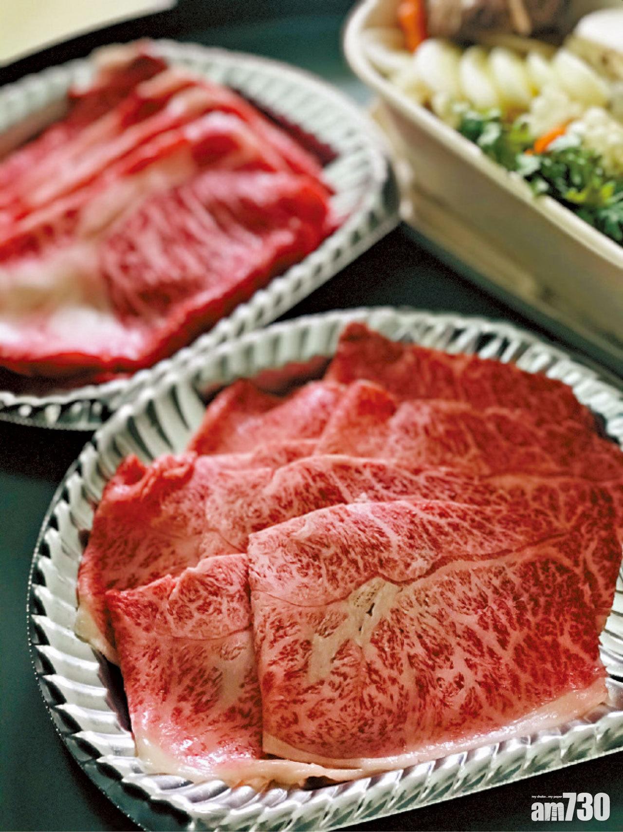 專營靚牛的華小料理屋,最近推出可以帶回家的二人前壽喜燒(Sukiyaki)外賣自取,兩款套餐主打雪花多多的日本佐賀和牛肩肉或肉味濃郁的澳洲純和牛,各含360克牛肉,足夠兩人撐枱腳。先將牛肉拼盤內附加的牛脂粒放淺鍋慢火煎至出油,再將野菜拼盤內的洋蔥炒至金黃,加入壽喜燒汁及一定比例的水煲滾,就可以放牛肉品嘗,蘸上蛋汁更和味!套餐另附前菜南瓜味噌冷奴、稻庭烏冬、日本鮮雞蛋及壽喜燒汁。