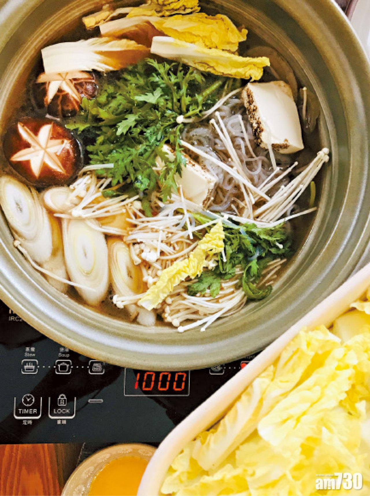 野菜拼盤有大蔥、鮮菇、金菇、春菊(茼蒿)、大白菜、蒟蒻及豆腐,非常豐富。