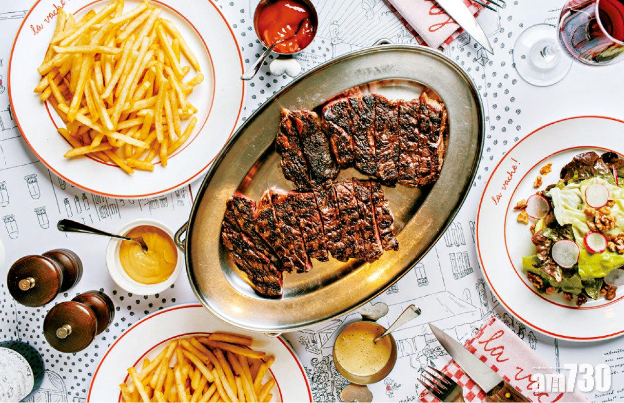 La Vache!無論午市或晚市都大排長龍,不過好處是不用看餐牌,這裡只供應一款經典牛扒薯條(Steak- frites)。甫坐下,侍應便會向你查問喜愛的牛扒熟度,然後奉上麵包籃及有機核桃沙律配黃芥末油醋汁,緊隨其後的是一塊10安士USDA Prime頂級美國安格斯肉眼扒,碟下方配備小蠟燭保溫,而無限量添加的金黃炸薯條,亦是最受食客歡迎的第二主角!這裡的招牌紅酒與牛扒當然是絕配,drink menu亦提供白酒、各式雞尾酒、汽水及果汁等選擇。