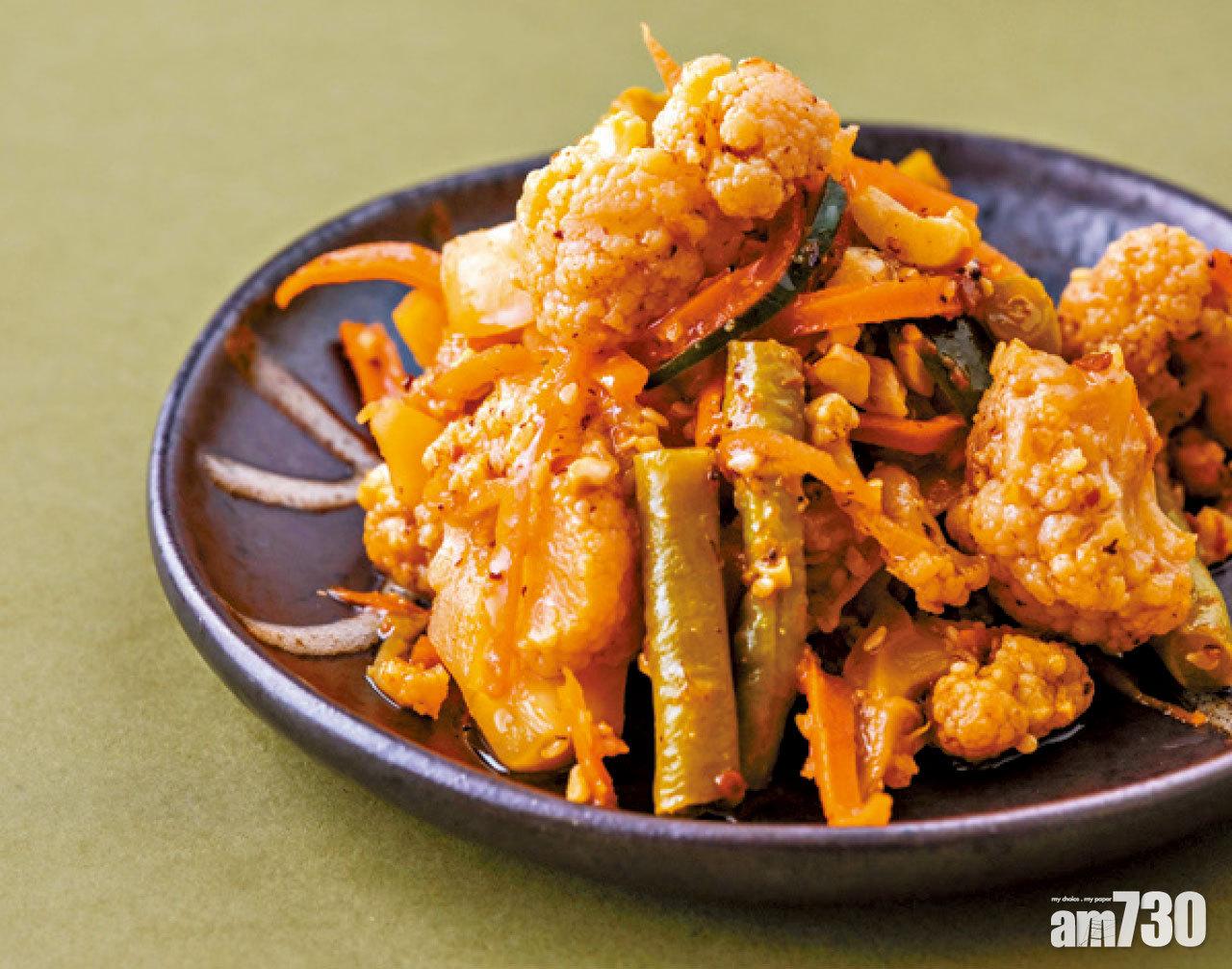 阿渣沙律,將酸子浸泡在水中成酸子水,再混合調味料,加入椰菜花、紅蘿蔔和菠蘿中醃味一晚,酸甜開胃。
