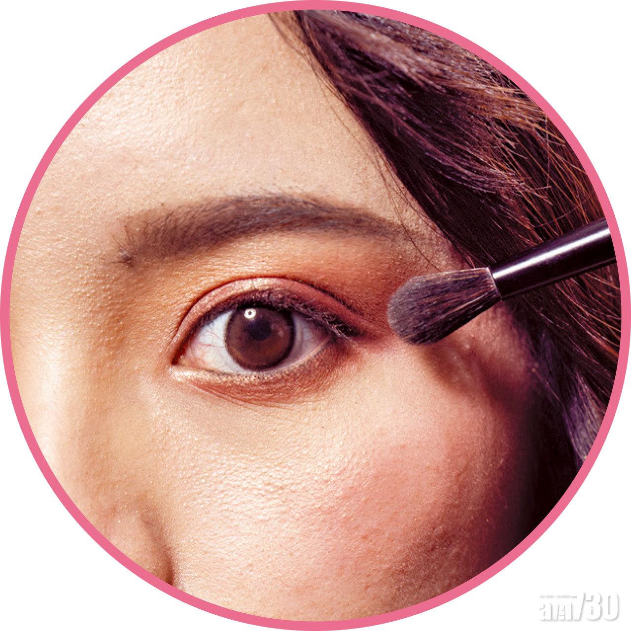 ❷ 眼妝用了迷你眼影組合,6種色調只要$300,CP值非常高。今次眼妝以ORGASM調子為主色,眼蓋中間位及下眼位置混合了金桃色及左下的蜜桃色,金屬質地帶來閃爍效果,眼尾用上霧面珊瑚色,眼頭以左上金屬淡粉色點綴,帶來漸變桃色。