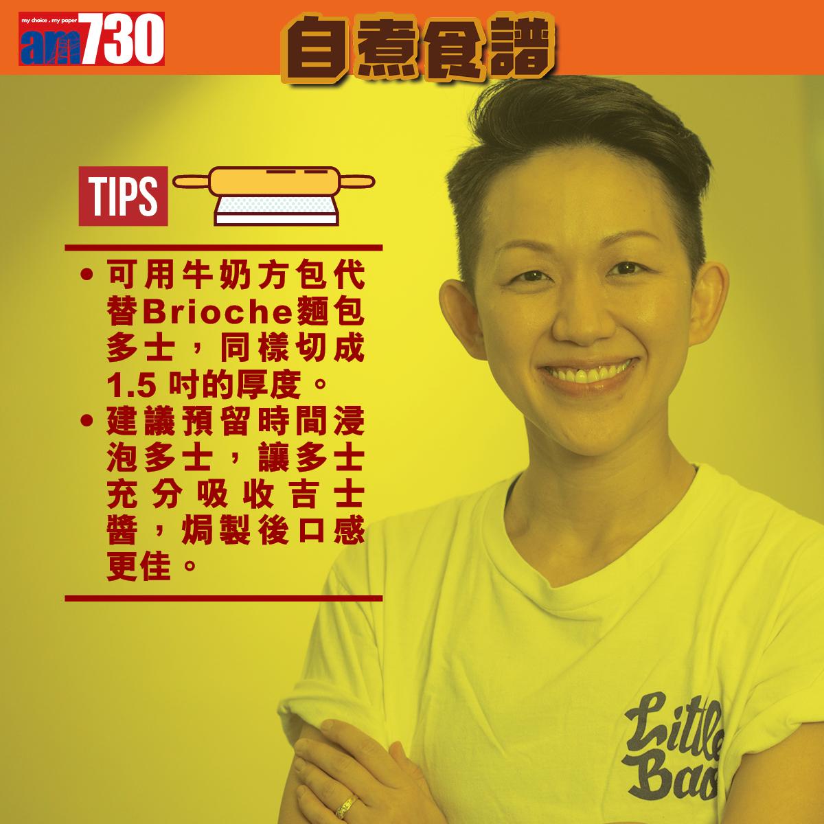 1.可用牛奶方包代替Brioche麵包多士,同樣切成1.5 吋的厚度。