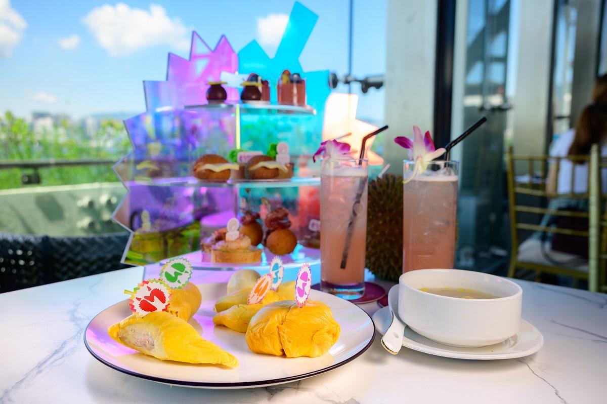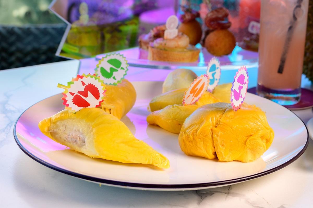 還有榴槤下午茶,當中大部分精緻鹹甜美點以榴槤炮製,如D24 榴槤芝士脆撻、D24 榴槤菠蘿油、山竹石榴無酒精雞尾酒啫喱、榴槤朱古力、榴槤吞拿魚他他墨西哥薄餅等等,選擇豐富。馬來西亞喇沙榴槤蝦多士味道最有驚喜,餐廳將自家炒製的喇沙醬配以榴槤果肉搽在多士上,濃烈的榴槤味遇上喇沙鹹香,惹味又獨特!D24榴槤菠蘿油亦有心思,以傳統法式泡芙作概念,並製成有港式菠蘿包的賣相,內裏夾著用D24 榴槤果蓉製成的Bavarois,整體玩味十足。