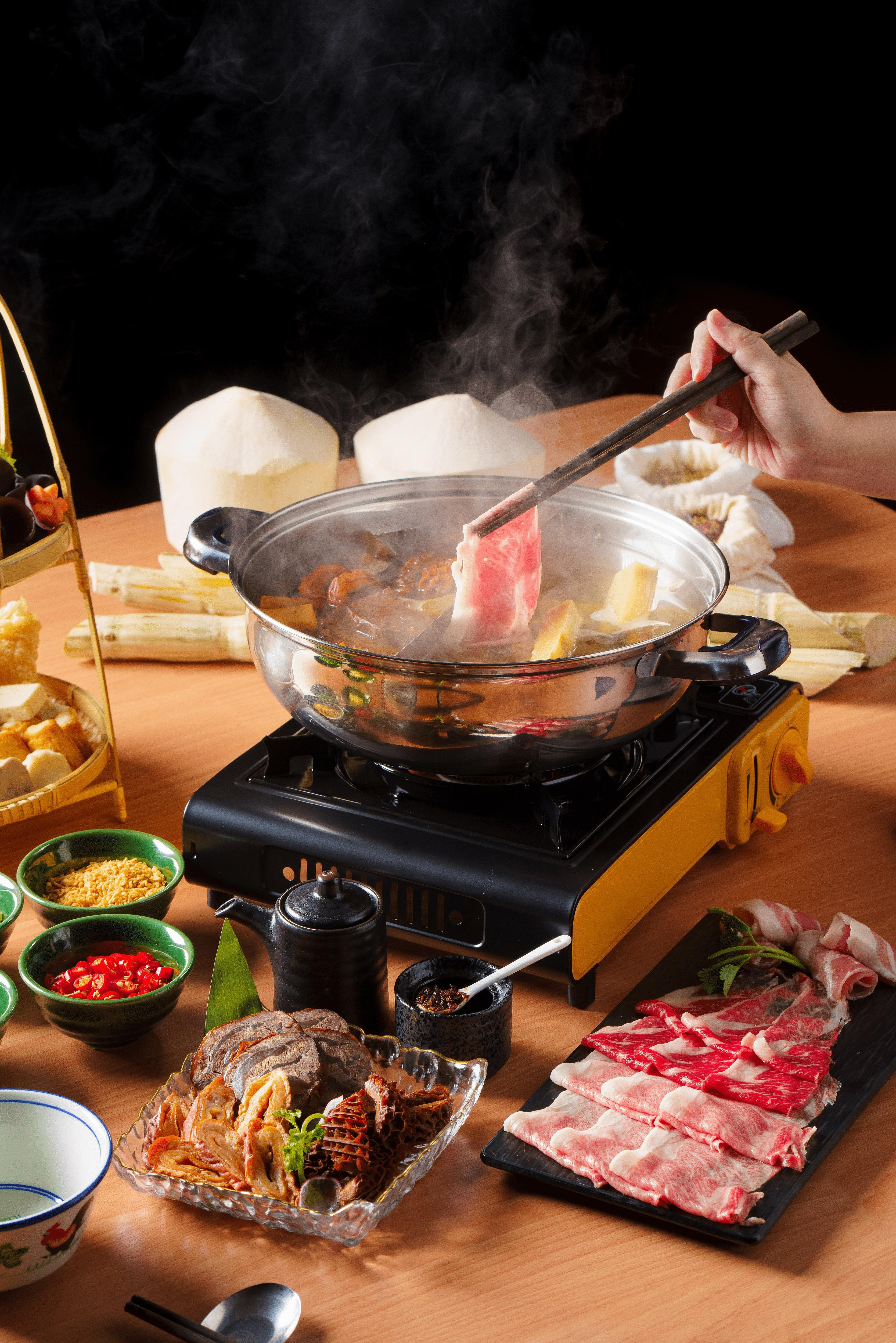 《燈籠滷味T.P.E.》推出2人火鍋套餐,一共有四款湯底選擇,包括與《公利真料竹蔗水》聯乘的「公利特選甘蔗椰香清雞湯」,湯底採用公利蔗汁、鮮雞及椰青等材料熬製,入口清甜,消暑又下火;而「燈籠招牌滷牛骨湯」選用了燈籠台灣總店直送滷湯,以多款藥材再加上大量牛骨熬製而成,濃厚而不膩。