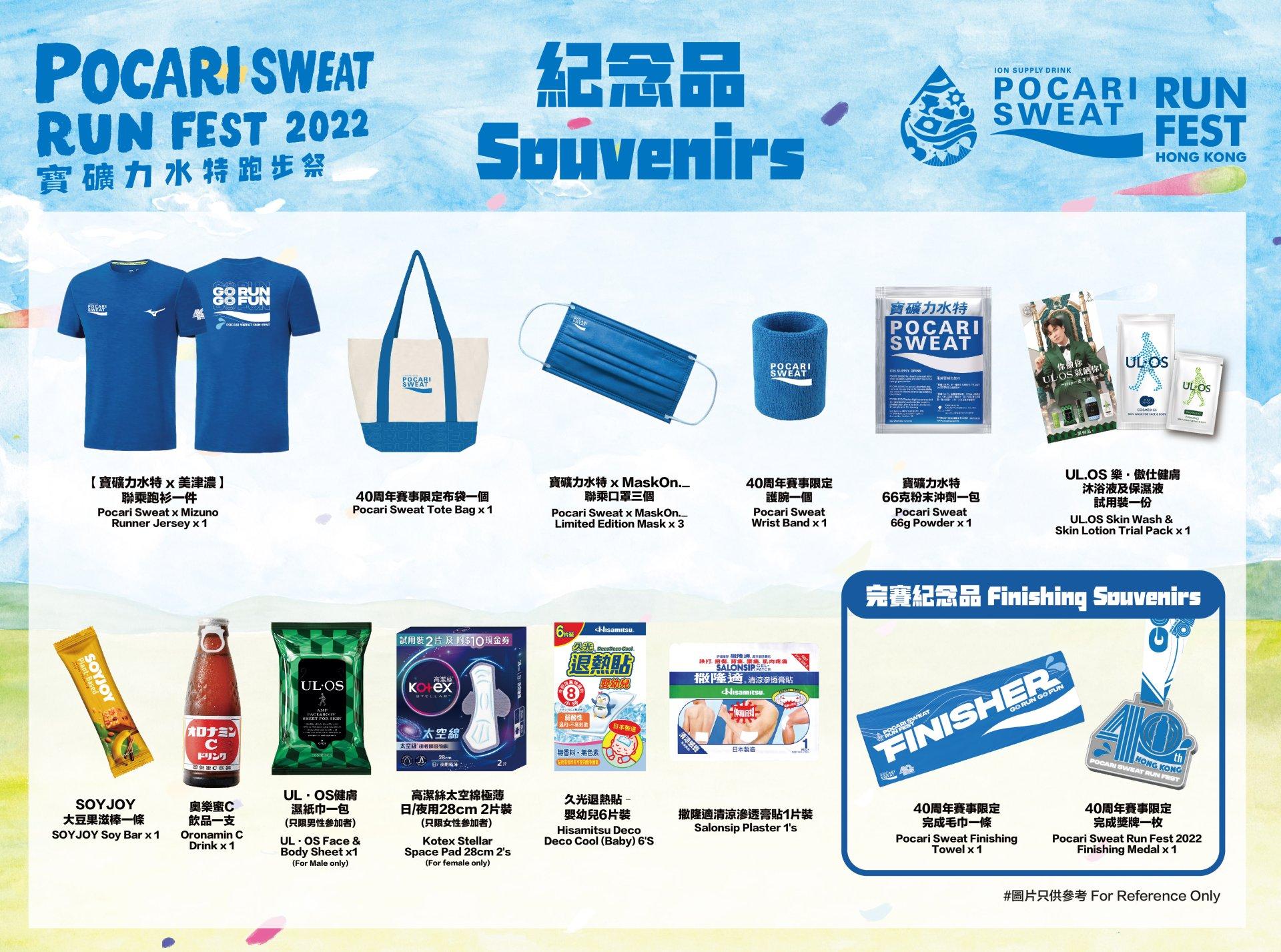 每位成功報名參與「5公里GO RUN賽」及「3公里GO FUN障礙賽」的人士,均可獲得「寶礦力水特跑步祭選手賽事包」1個及豐富紀念品,其中包括「寶礦力水特x美津濃」聯乘跑衫1件、「40周年賽事限定布袋」1個、「40周年賽事限定護腕」1個、「寶礦力水特x MaskOn._」聯乘口罩1盒(3個)等。