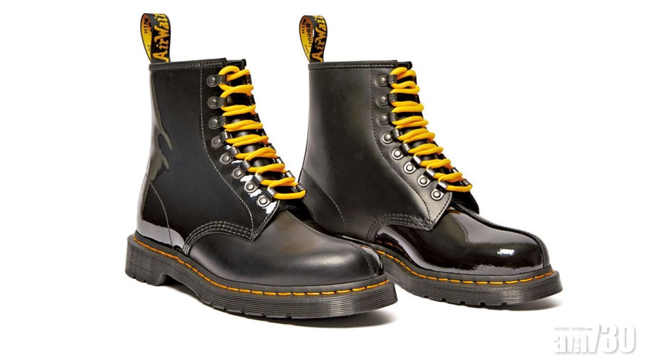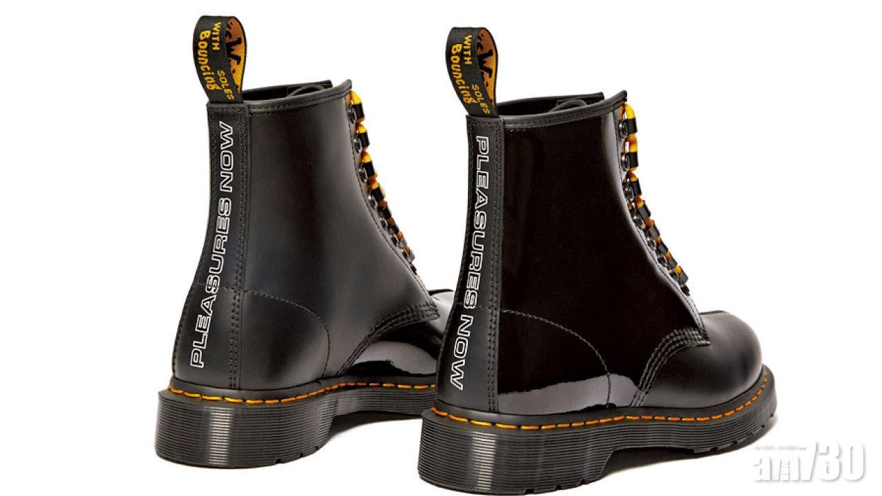 它由兩種不同的材質混合而成:New Wave的拋光漆皮皮革與Dr. Martens的Smooth皮革。鞋根位置印有「PLEASURES NOW」字眼,將團結與音樂流派的深遠歷史貫徹於作品之中,同時配有雙鞋帶和鉤眼。(售價$1,599、查詢:2892 1832)。