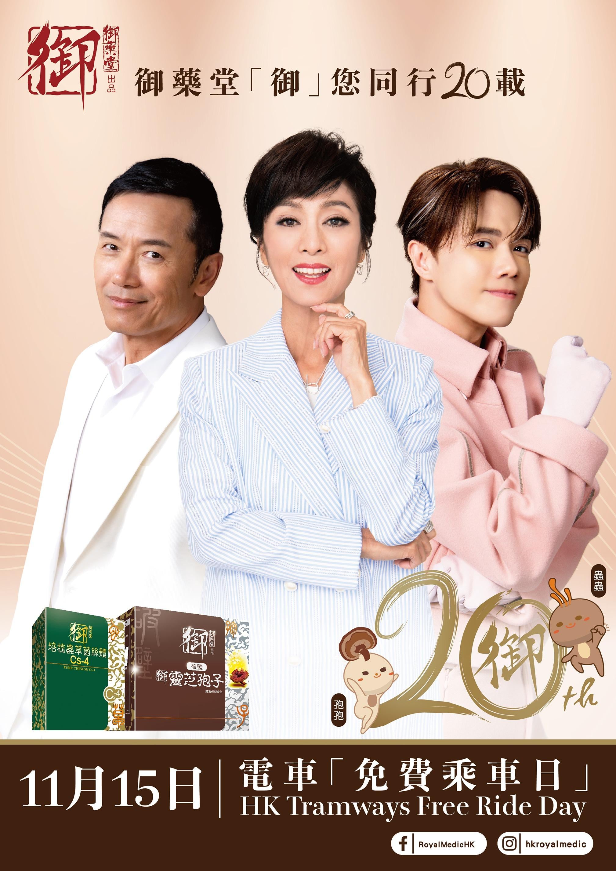 「日日keep住食,藥箱都變成首飾箱!」相信不少人聽到都會想起御藥堂,御藥堂為慶祝20歲生日,將於明日(11月15日)請全港市民免費搭「叮叮」,屆時代言人米雪及新加入的20周年大使張敬軒更會乘坐「御藥堂生日派對電車」出巡。
