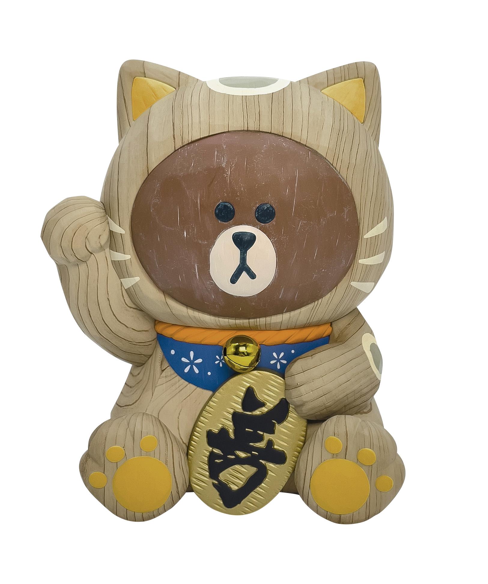 此外也少不了首次登場的「狸貓BROWN」18cm潮玩擺件,心地善良的BROWN換上狸貓造型外衣,戴上代表著化除災難、惡運的斗笠,右手拿著表示誠信的儲金簿,左手拿著代表可以不愁三餐溫飽的酒瓶,頂著白白的大肚腩,側著頭可愛地望向前方,代替狸貓扮吉祥物向大家派發好運和福氣。擺件做工精緻細膩,BROWN帶著的眼罩加入磁吸技術,把眼罩脫下更可見到閉上眼睛的BROWN。作品將會在「LINE FRIENDS MEETS URDU 善心 ⋅慈善活動」期間展出,並於開幕日特別率先安排300隻的慈善名額作慈善義賣預售。這不單是幸運潮玩擺設物,更是結合傳統、潮流及慈善意義的藝術品,極具收藏價值。