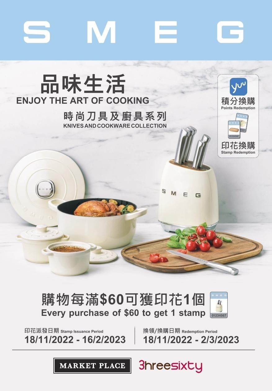 惠康旗下的高級超市Market Place,與著名意大利廚房電器品牌SMEG,推出全新印花活動,由1118日至明年216日期間,顧客凡購物每滿港幣$60,即可獲得印花一個,集齊指定數量的印花或yuu積分,即可獨家免費換領或換購一系列奶油白色的時尚刀具和廚具。是次的印花換領活動更讓yuu會員以指定的yuu積分免費換領指定產品,要好好把握機會善用積分。