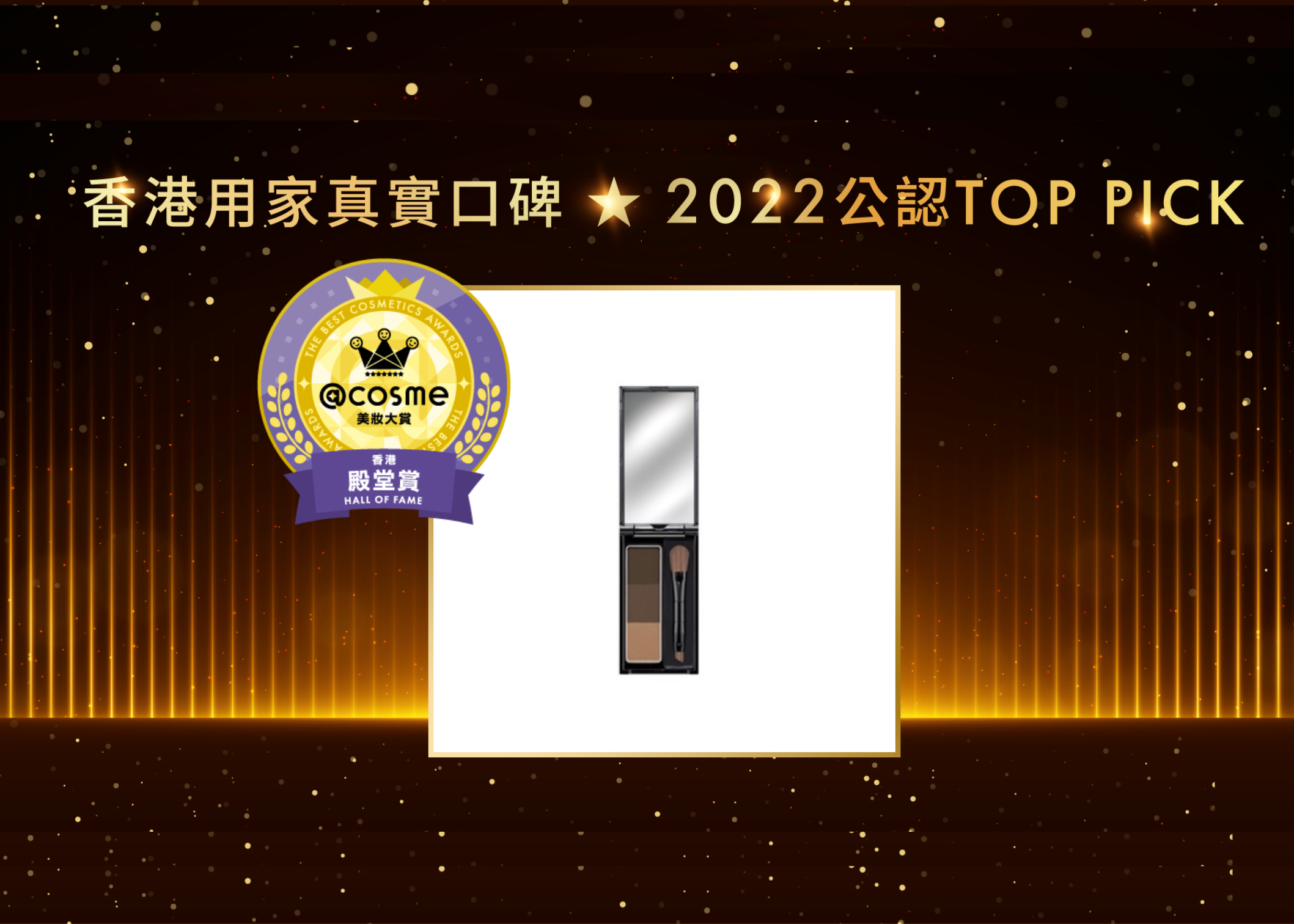 「@cosme香港美妝大賞」來到第三屆,今年新增了「殿堂賞」,要獲得這項殊榮,產品必須連續3年獲得「@cosme香港美妝大賞 部門賞」第一名,所以獲獎產品需堪稱為「神枱級」的好用,才能得到獎項。首個「@cosme香港美妝大賞 殿堂賞」分別由KATE TOKYO 3D造型眉彩餅、The Body Shop茶樹油及excel裸色深邃眼影獲得,它們於眉彩部門、護膚油・護膚部門和眼影部門中多年獲得第一名,經得起時間考驗。