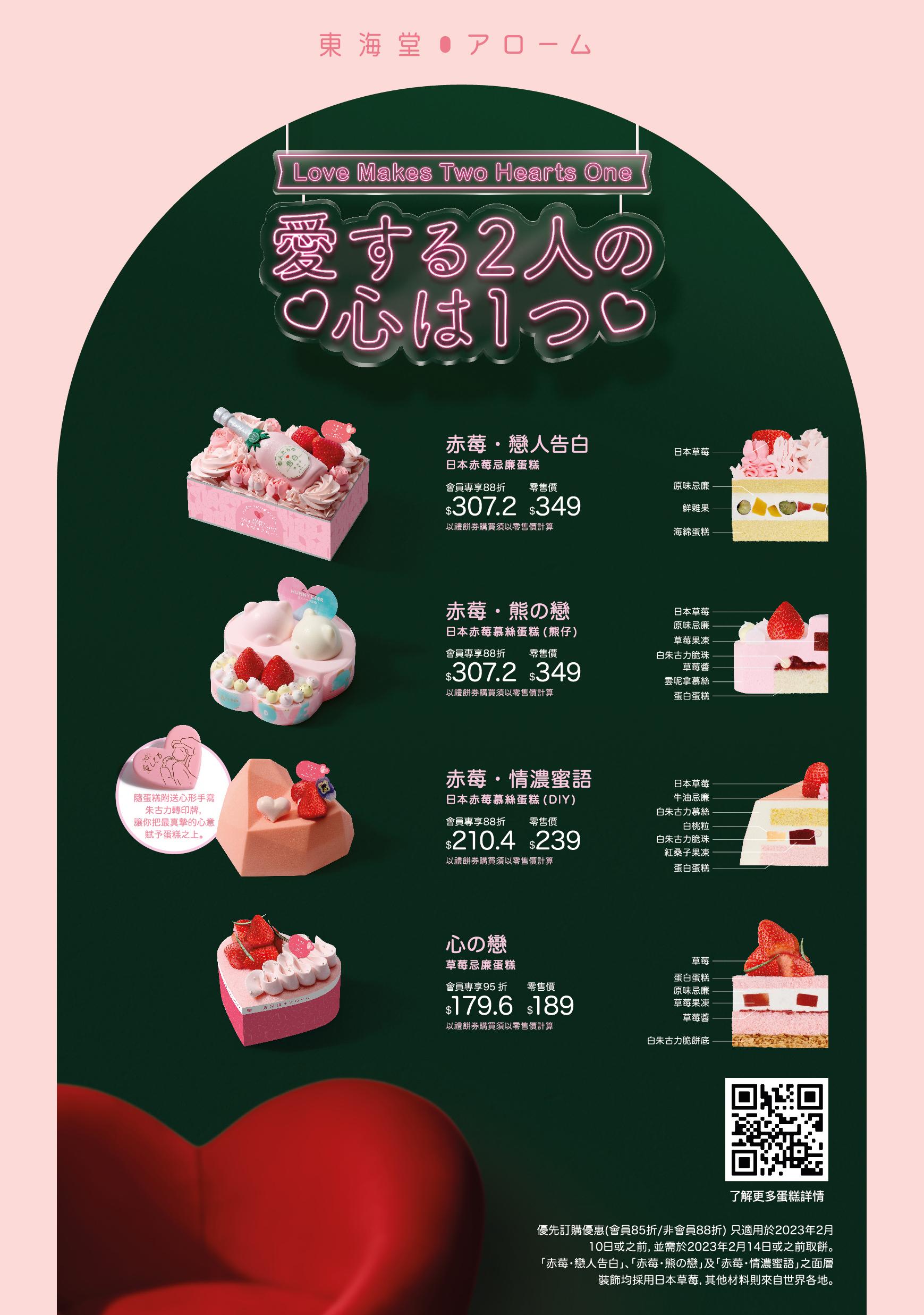 4款蛋糕將於2月3日起於東海堂門市發售,供應期至2月14日。由2023年1月31日至2023年2月10日,東海堂會員優先訂購情人節蛋糕更可享85折優惠!