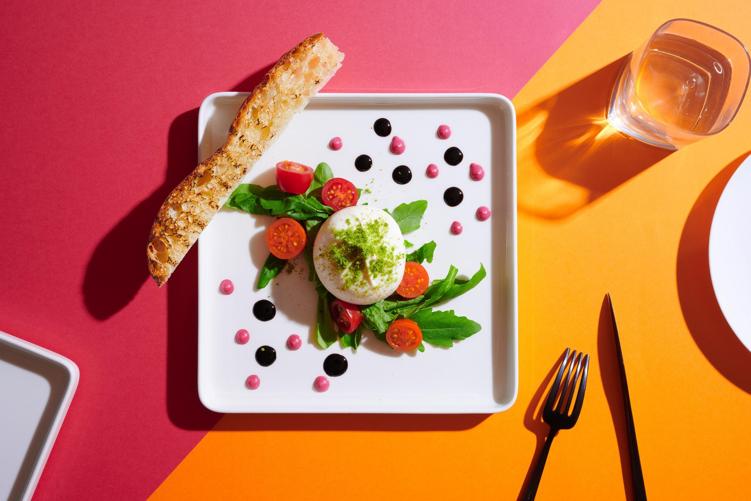 ADD+的「波點女王」創意餐單,開胃前菜可選擇意大利水牛芝士糅合多元創意,新鮮意大利馬蘇里拉水牛芝士,注入香滑的忌廉,搭配火箭菜和車厘茄,形成鮮明對比。由於波點是草間彌生最具標誌性的風格圖案,因此碟上綴有分別以濃縮意大利黑醋及自家製紅菜頭蒜茸蛋黃醬的小波點,呼應視覺藝術主題。