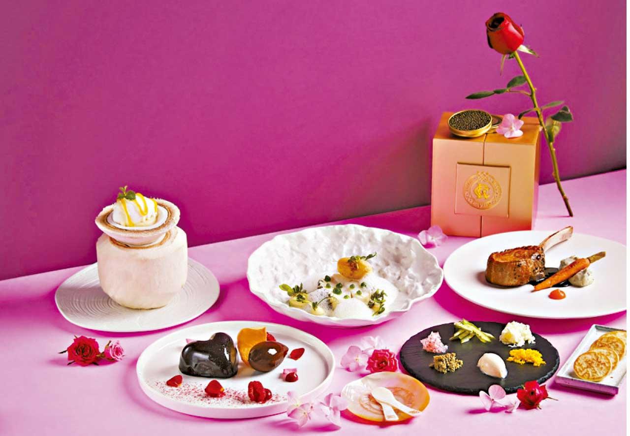 想邊飽覽維港景觀邊歎美酒佳餚,便可考慮香港柏寧酒店露天酒吧SKYE推出的「2人限定情人節魚子醬套餐」($1,960)。法式大餐先是Royal Cavier Club 30克罐裝魚子醬及水煮海鱸魚柳配白酒忌廉汁作頭盤,後上菠蘿椰香雪葩,主菜為牛仔肉架,最後以64%朱古力慕絲作結。另推出情人節特色雞尾酒 LOVE CODE($120),可一嘗以麥燒酎、抹茶、奶油、可可及爆谷泡泡調配出的醉人味道。