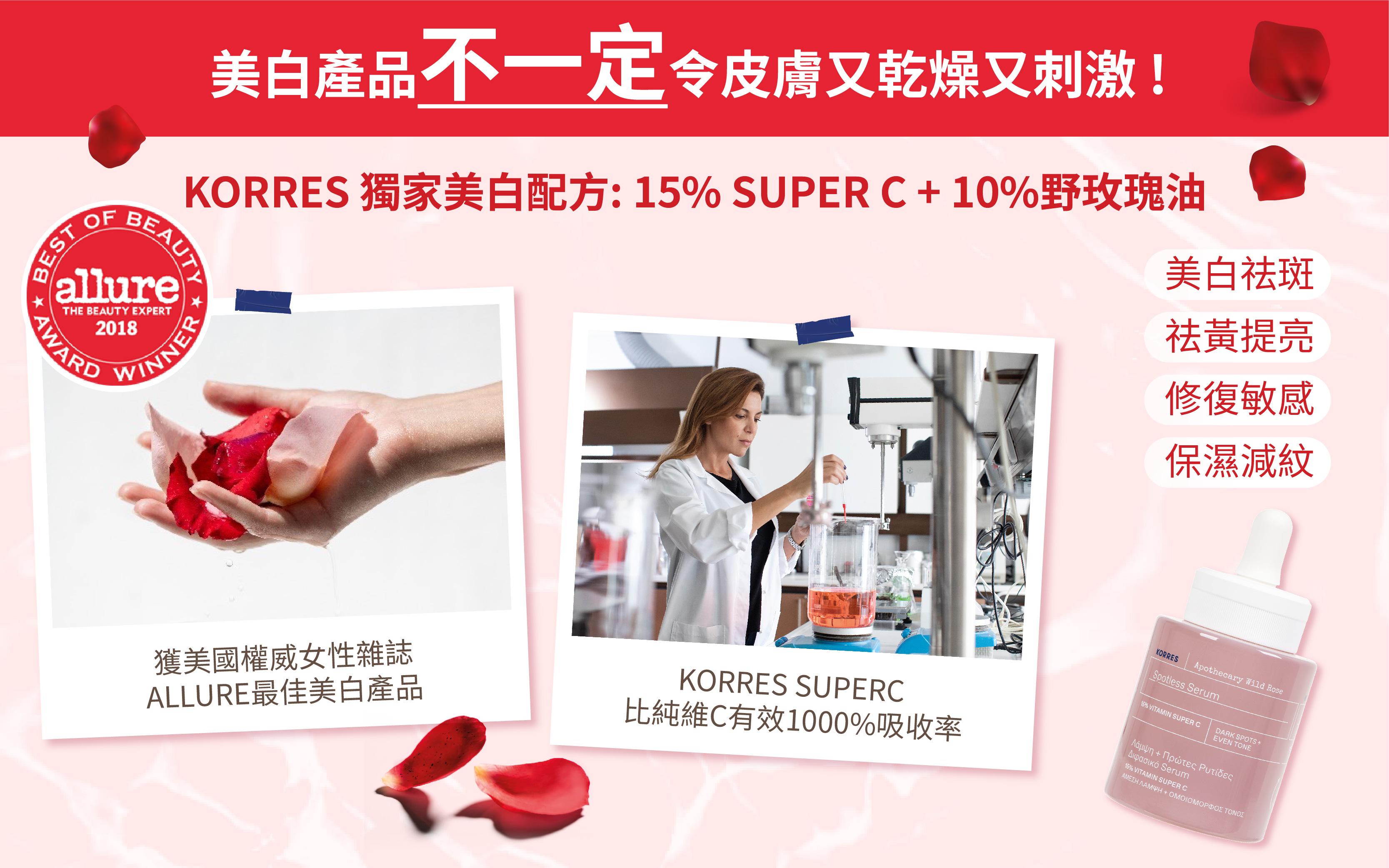 維他命C本身分子非常不穩定,遇上光及氧氣易被分解和失效,KORRES團隊研發創造出高穩定及不致敏的維他命C,並命名為SuperC。KORRES SuperC油溶性特質令它更易被肌膚吸收,臨床測試証實比純維C有效1000%吸收率。成分中更加入地中海野玫瑰(由古羅馬時代已被希臘人使用的美容配方),極緻修復敏感、祛黃、減紋。