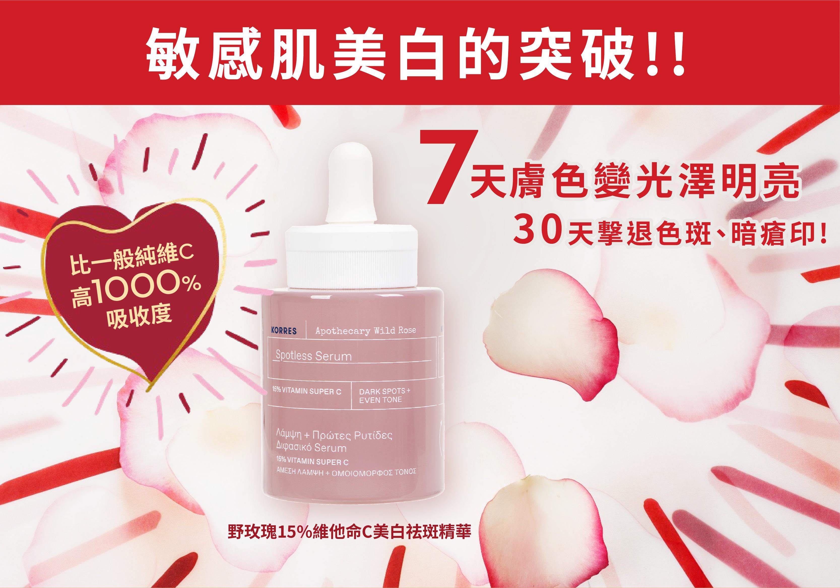敏感肌最怕使用護膚產品時皮膚過敏,尤其害怕使用美白去斑產品,怕皮膚因而受到刺激,令敏感問題更嚴重。KORRES推出的野玫瑰15%維C美白祛斑精華和野玫瑰維C美白祛斑面霜就成為敏感肌的美白福星!產品聲稱可以7天令膚色變光澤明亮,30天擊退色斑、暗瘡印,重拾亮澤肌膚!