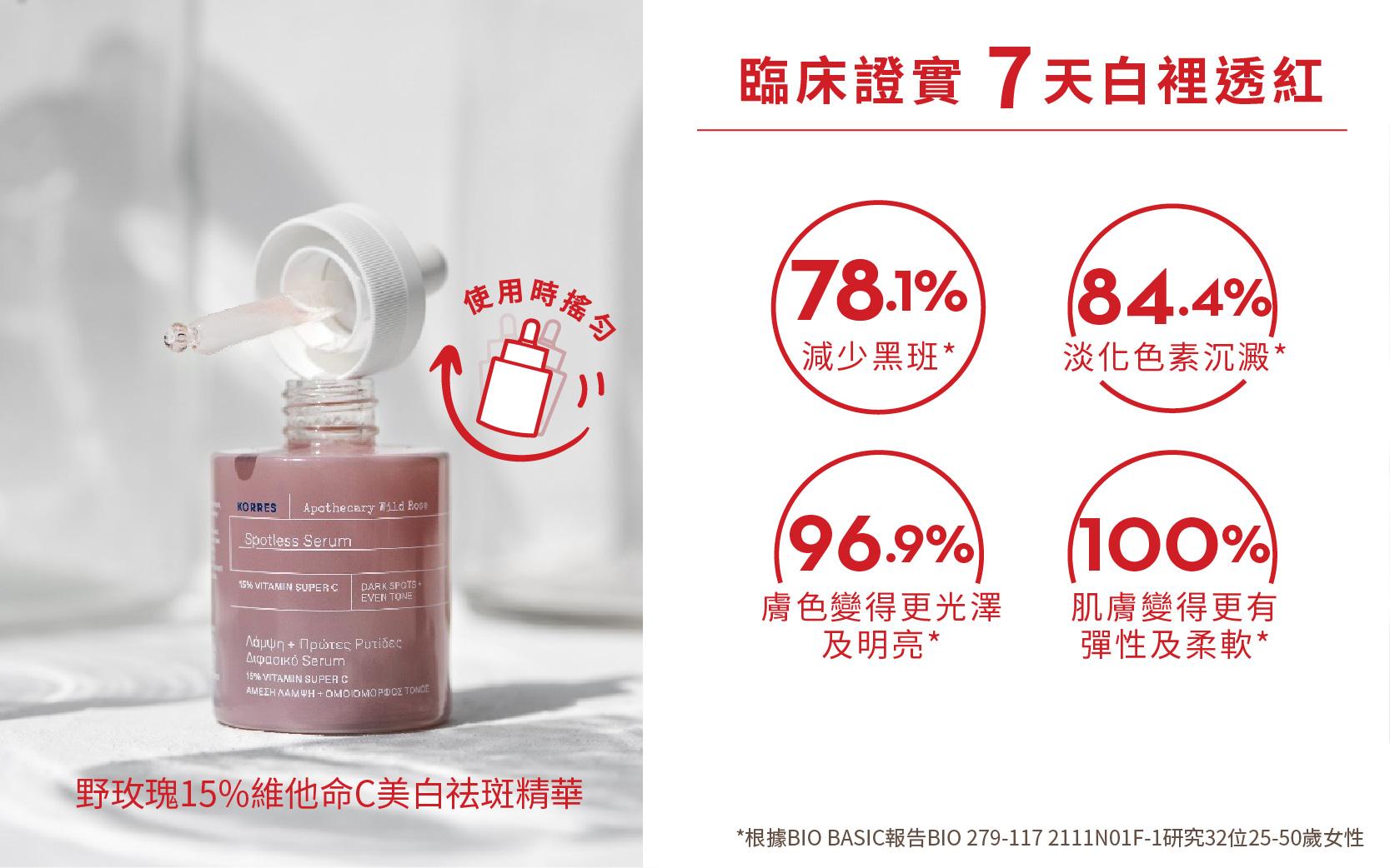 KORRES野玫瑰15%維C美白祛斑精華含83.1%天然成分,是問題肌都可以用的美白產品,能集中對付色斑及色素沉澱等問題,同時為肌膚注水以保持肌膚水潤嫩滑;KORRES獨有的水油分層配方,令油溶性(上層)及水溶性(下層)成分的活性得以保存,使用時搖勻便可以把所有活性釋放。