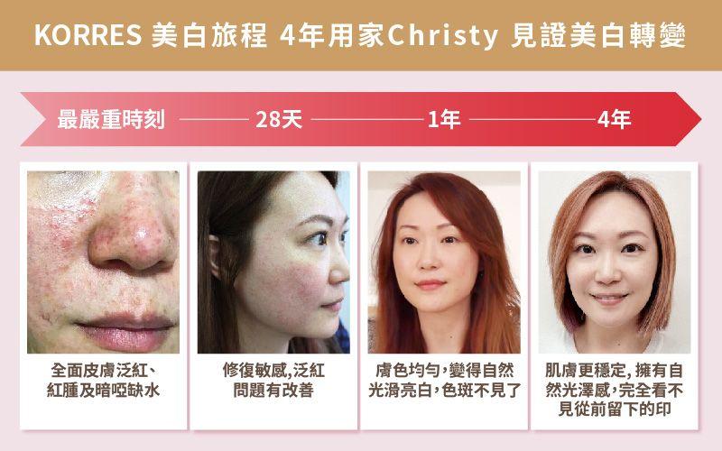 「因為太好用, 我一直有回購,現時已經用到第4年!KORRES Super C美白精華已成為我必買的保養品之一,它的效果令我非常滿意!臉上的色斑和印都消失了,皮膚更穩定,KORRES的美白精華拯救了我的皮膚。」Christy說。