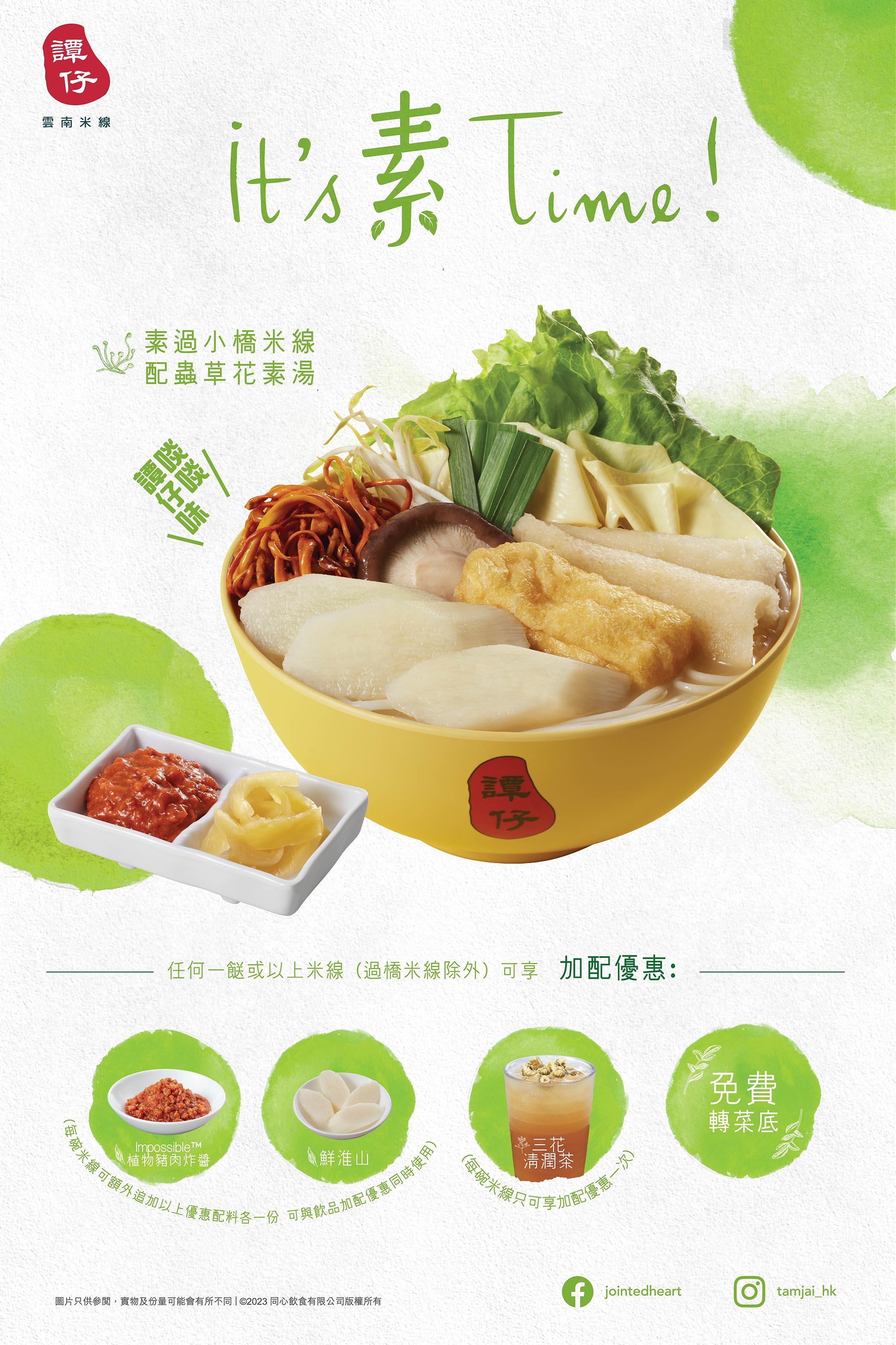 譚仔雲南米線和譚仔三哥米線於去年首度攜手合作推出「So Green 素 tasty!」企劃後,今年再度推出素食系列!除了再次以Impossible™植物豬肉為主要食材外,亦加入營養價值極高的鮮淮山,更有蟲草花素湯及菇菌湯,素食人士必試!