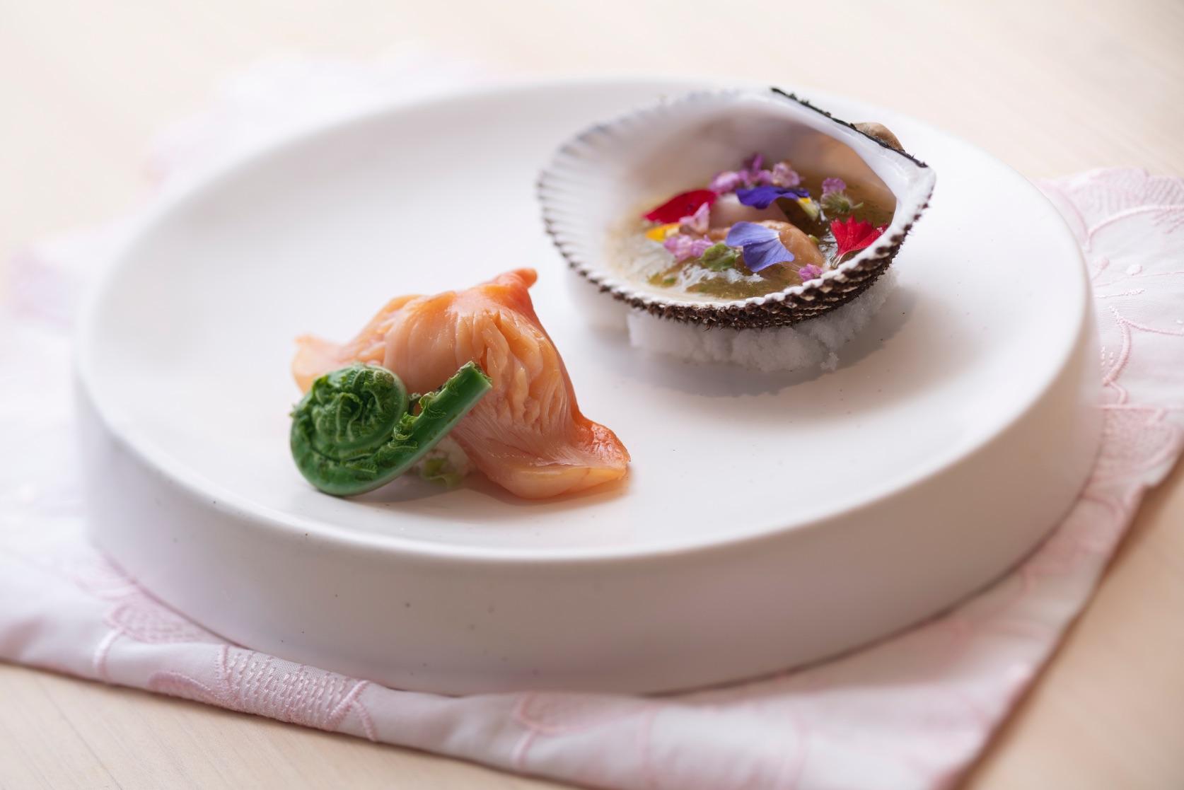 赤貝木棉豆腐,新鮮活赤貝配以木棉豆腐,加上春天的山菜和青新的青瓜啫喱,春天感滿載的一道酒餚。另一道鮟鱇魚肝配竹筍天婦羅,用上傳統的煮法的北海道鮟鱇魚肝,配以當季的竹筍天婦羅加上調配好的白味噌醬和炸牛蒡,為綿綿的鮟鱇魚肝增加了一種香脆口感。