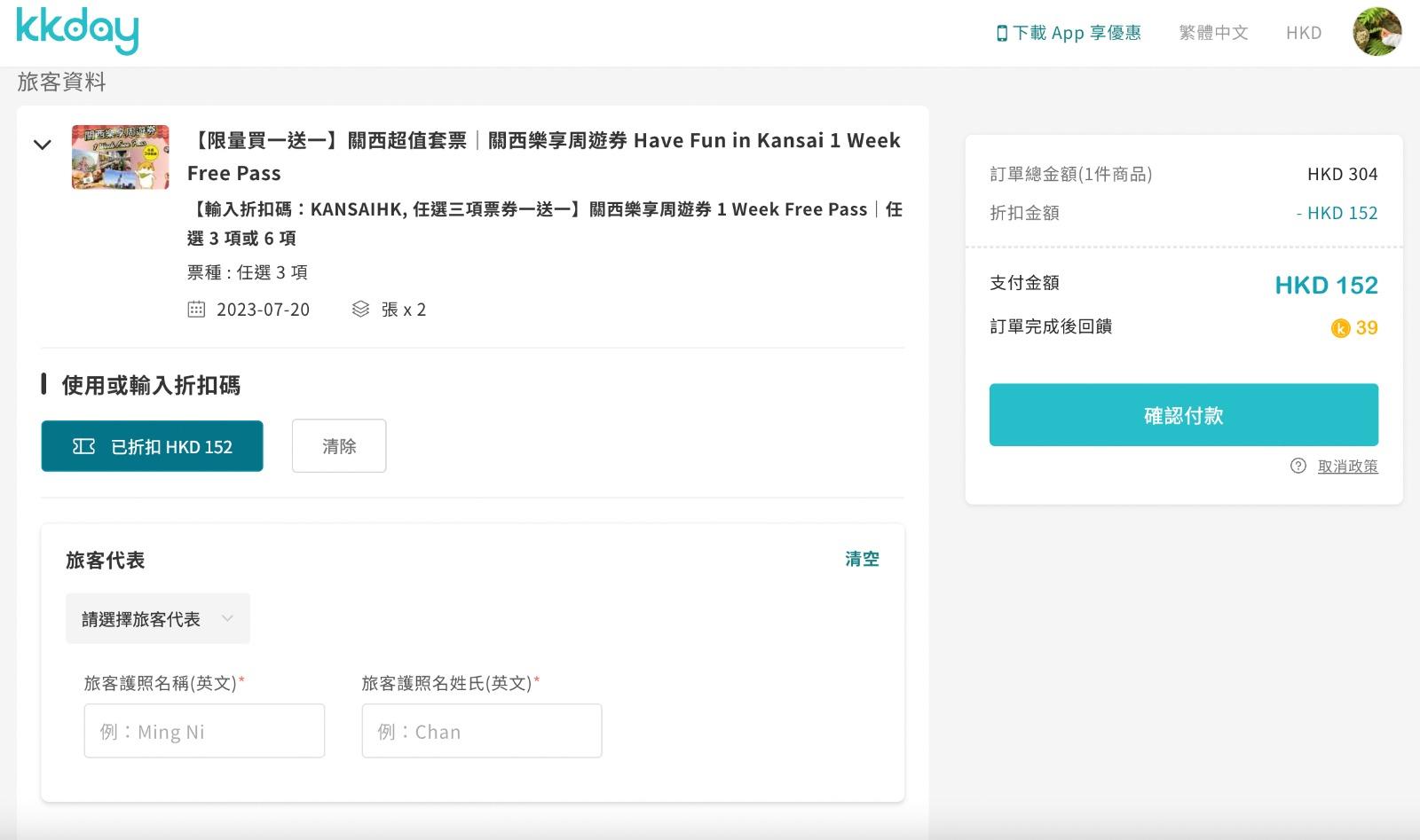 先選購兩張【任選3項】周遊券,再輸入折扣碼「KANSAIHK」,即享買一送一優惠。