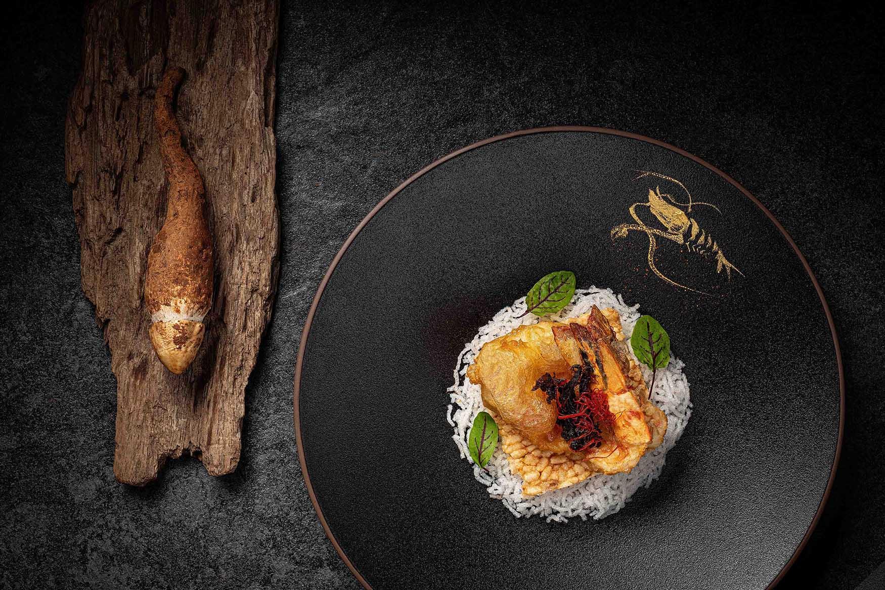 油雞㙡琵琶虎蝦窩巴($228)─雞㙡菌肉質肥厚如雞肉,切絲後加入花椒及辣椒一起 油炸成油雞㙡,配上炸虎蝦搭、脆窩巴及香醋汁,酸辣誘人。