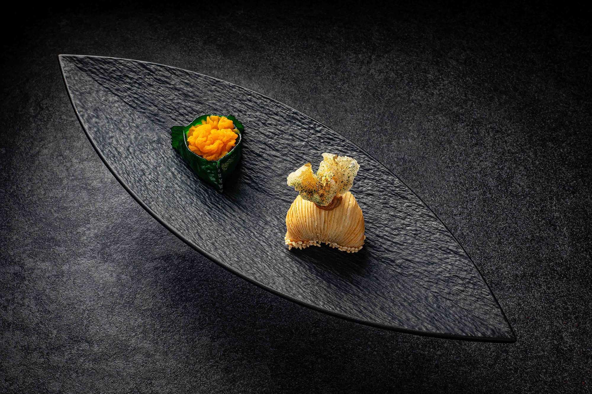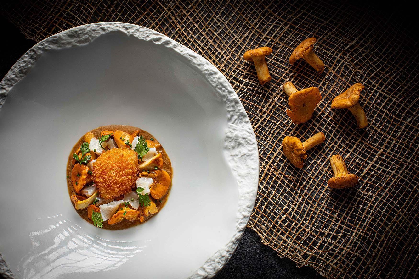 雞油菌琥珀鮰魚金肚粒($288)─採用具天然藥效珍稀的雞油菌,帶杏香及微微的嚼勁,配搭爽彈柔滑的鮰魚肚、炸流心蛋及乾雞油菌醬,味道相輔相成,完美映襯雞油菌的滋味油香。