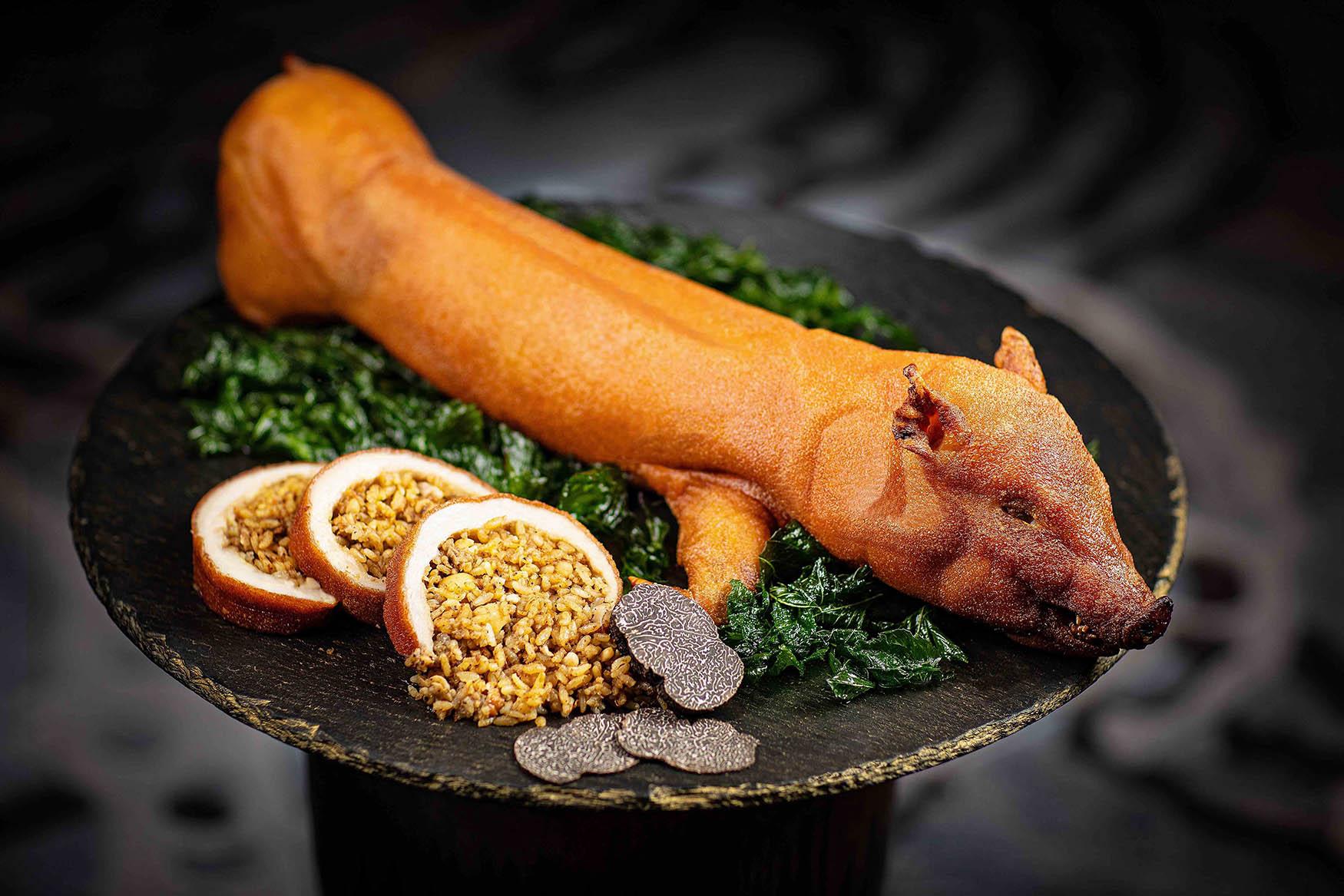陳師傅的另一道招牌菜式「黑松露薏米燒釀乳豬」,原隻乳豬烤得外脆內嫩,中間釀入黑松露、糯米、薏米、鴨肝、燒鴨粒、火腿及蓮子,每口充滿黑松露的精華,上菜時即席刨片的新鮮黑松露,香氣馥郁。(每隻$2,088須預訂)