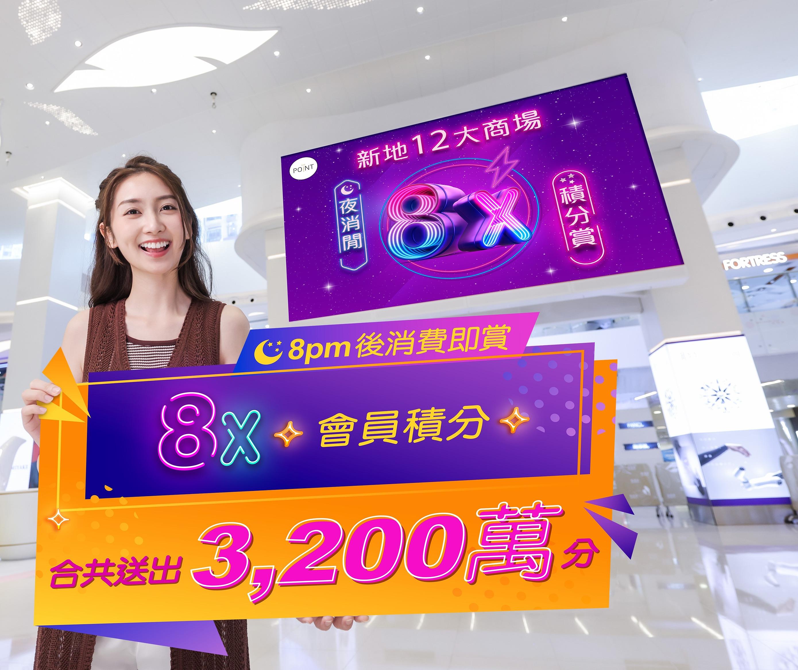 -逢星期五至日及公眾假期晚上8時後,在參與商場內的零售商戶以單一消費滿$800以上,即可獲得8The Point積分(例子:消費$800便可獲6,400會員積分)!