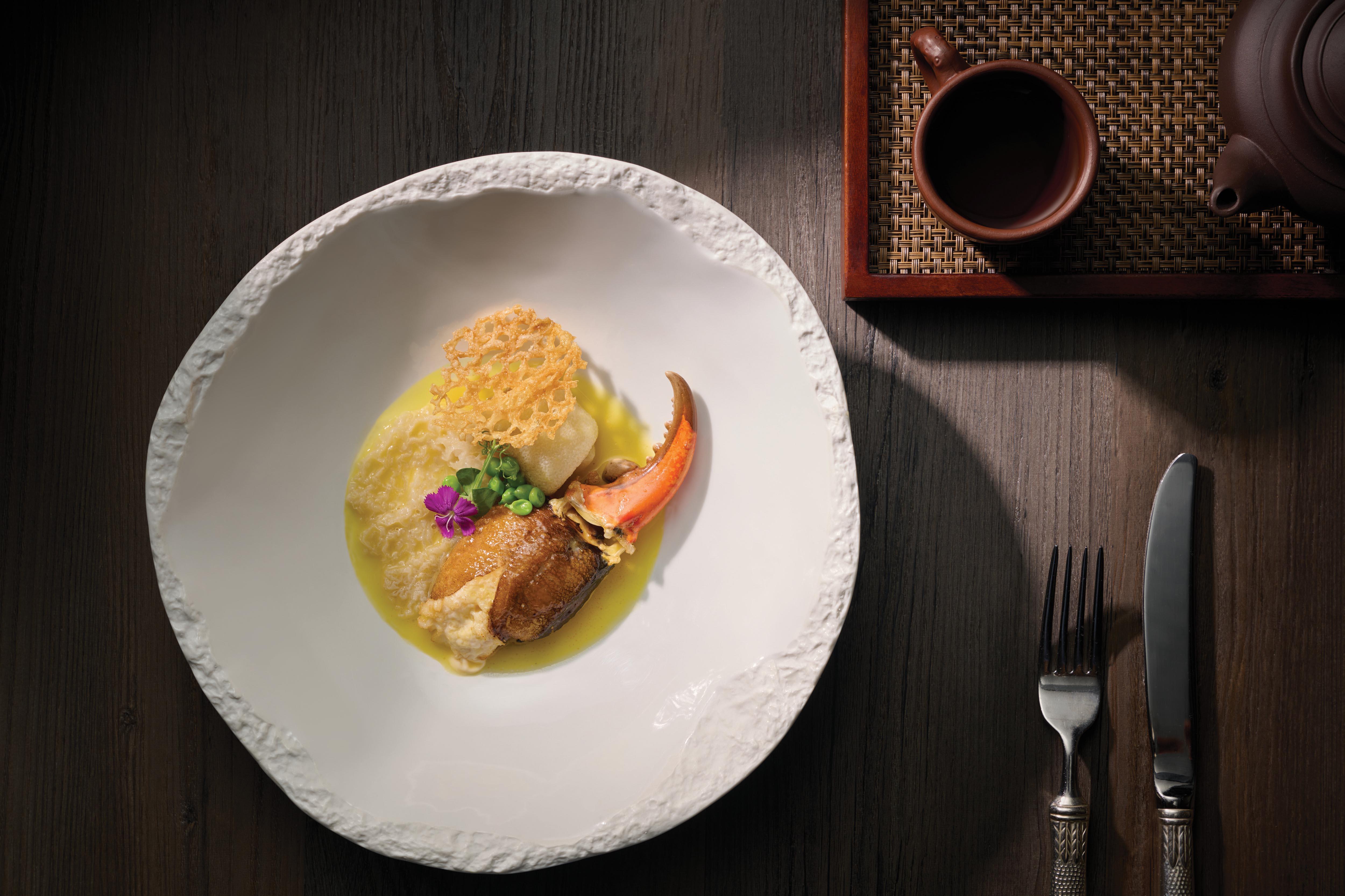 「鮮竹笙濃雞汁蟹鉗」($588)這一道菜亦運用了靈活多變的粵菜烹調手法,盡顯師傅功架。肉厚富 鮮味的蟹鉗先以猛火油炸,再加入濃雞湯一起燜煮提鮮,鑊氣十足,嫩滑多汁。細心燉煮五小時成金黃色 的濃雞湯充滿膠質,豐腴醇厚,蟹鉗與鮮竹笙充分吸收湯汁精華,鮮甜無比。最後飾以香炸竹笙片,昇華 口感層次。