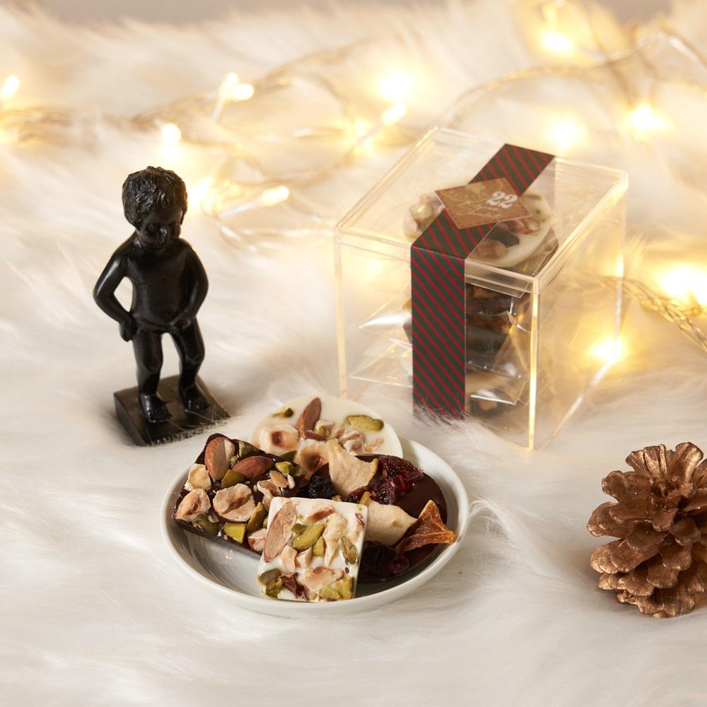 雪花掛飾禮盒內有兩款口味,牛奶及黑朱古力榛子脆珠採用焦糖化的榛子,口感爽脆,再以朱古力硬殼包裹;而牛奶朱古力糖漬檸檬皮條以朱古力包裹酸甜的糖漬檸檬皮條,煙韌的果皮與幼滑的朱古力脆皮相互交融,呈現獨特的口感及味道。雪花造型別緻的禮盒,可成為聖誕樹上的飾品,一物兩用。