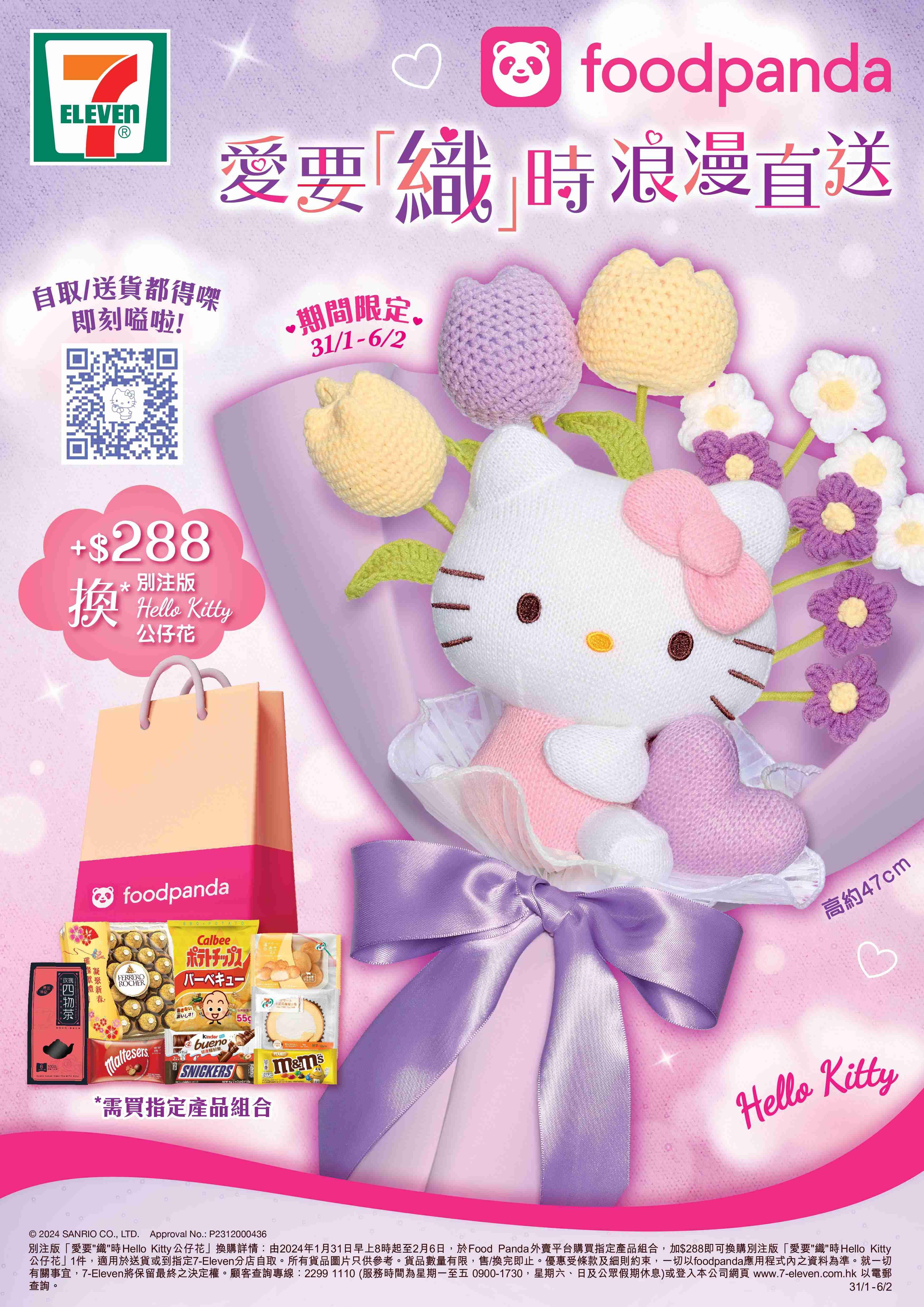 由2024年1月31日早上8時起至2月6日,於foodpanda外賣平台內的7-Eleven購買指定產品組合(價值$100),加 $288 即可換購別注版 「愛要"織"時Hello Kitty 公仔花」1 件*,適用於送貨或到指定174間7-Eleven分店自取。