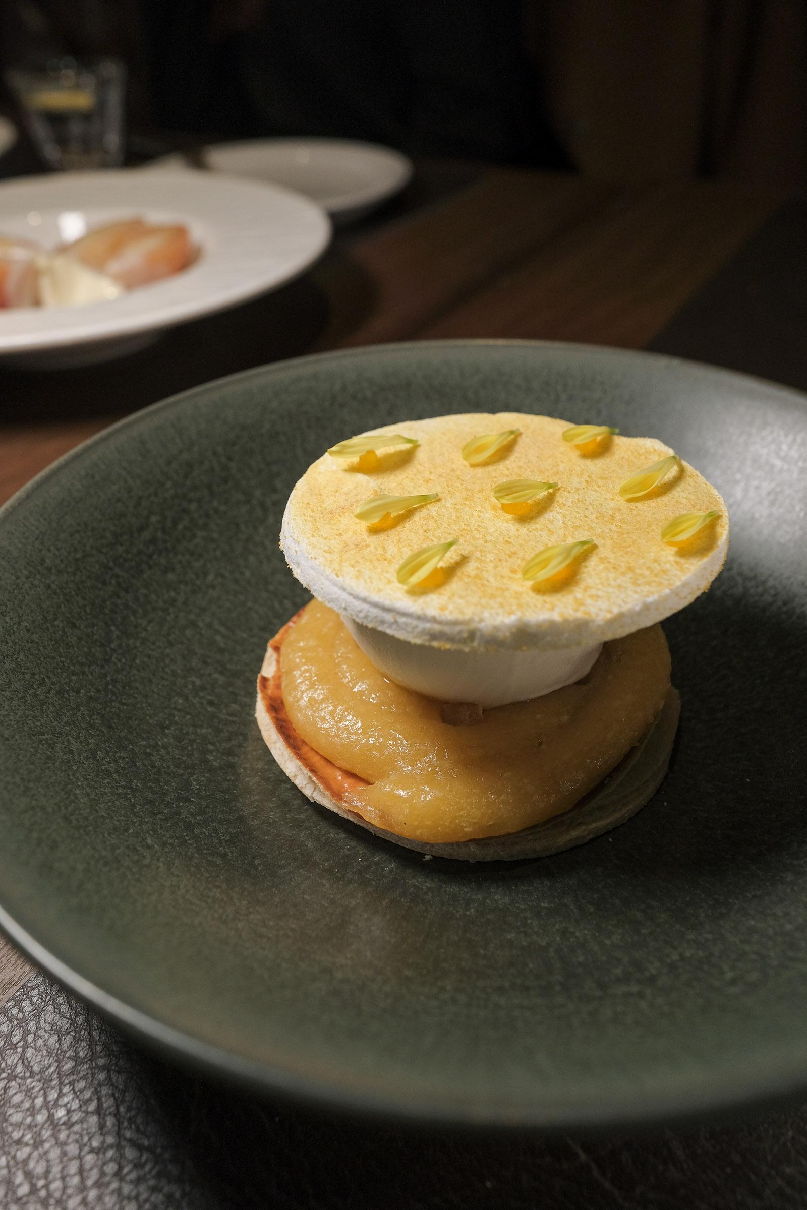 甜品「摩登老婆餅配熱帶風情意式雪糕」─驚喜度爆燈之作,傳統港式老婆餅為靈感,用百香果和糖冬瓜麻糬為基礎,配上椰子意式雪糕和蛋白酥皮,最後綴以紅棗汁;每一口都是熟悉卻新穎的味道。