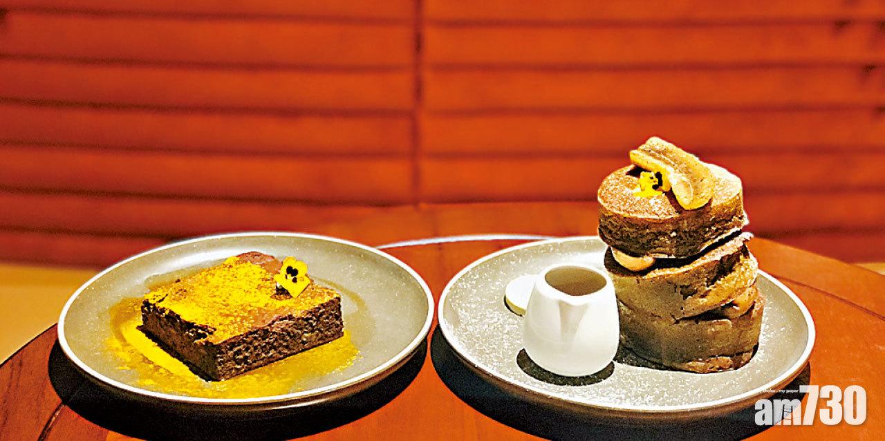 (左)黃薑粉為無麩質純素(無蛋奶)brownie灑上一層金光,加上食用花造型滿分,糕身較一般的鬆軟,黃薑粉巧妙地令朱古力味道變得更有層次$54。(右)抹茶班戟加焦糖香蕉。$118