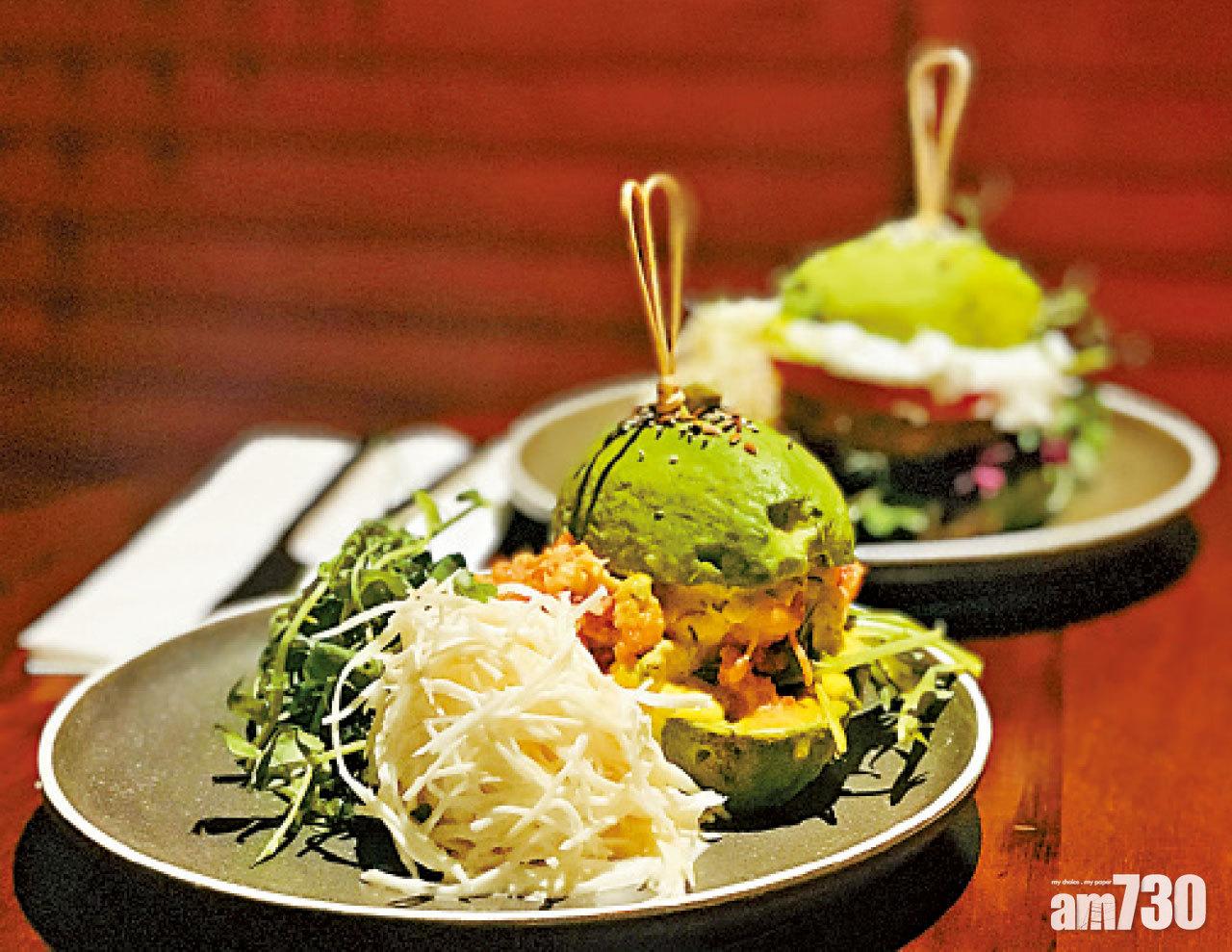 主廚將整個牛油果切開取代傳統麵包作漢堡,打造牛油果龍蝦特色漢堡(前);另有素食炸紅扁豆番薯餅牛油果特色漢堡。$198/$148