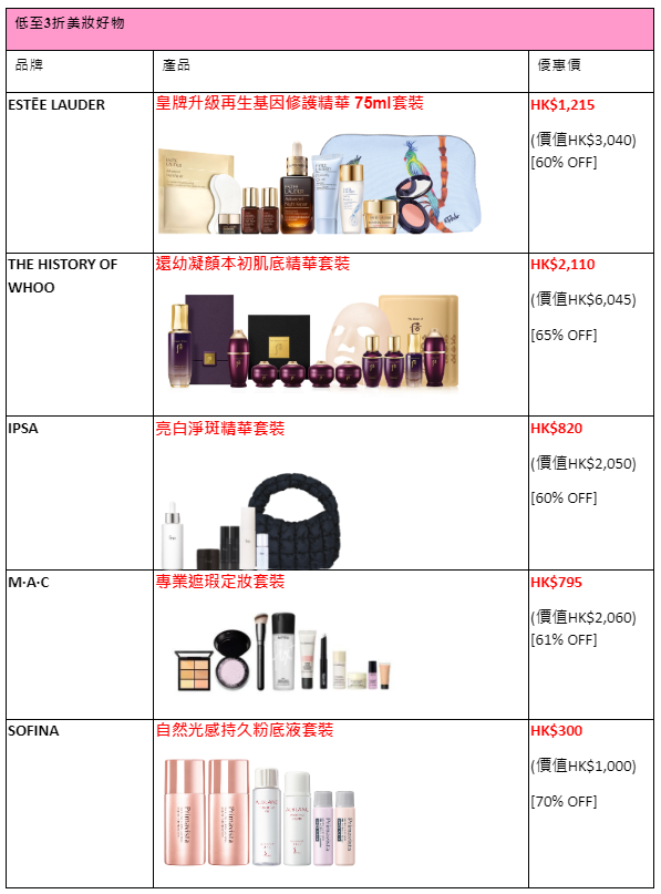全場超過300款美妝護膚禮遇及套裝低至3折