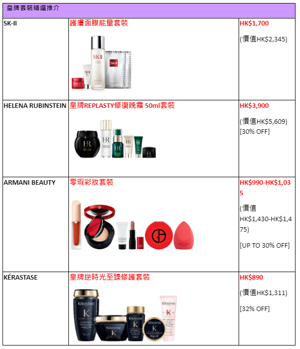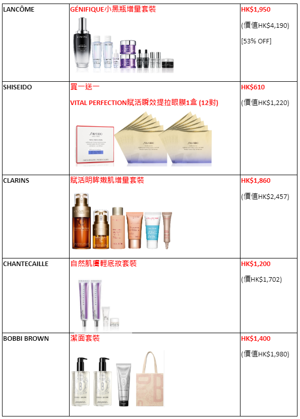 活動期間,多項頂級美妝護膚好物低至3折,如ESTĒE LAUDER皇牌升級再生基因修護精華75ml套裝HK$1,215(價值HK$3,040)及THE HISTORY OF WHOO還幼凝顏本初肌底精華套裝HK$2,110(價值HK$6,045);更有皇牌套裝精選推介,包括SK-II護膚面膜能量套裝HK$1,700(價值HK$2,345)、HELENA RUBINSTEIN皇牌REPLASTY修復晚霜50ml套裝HK$3,900(價值HK$5,609)、ARMANI BEAUTY零瑕彩妝套裝 HK$990-HK$1,035(價值HK$1,430-HK$1,475)。此外,SHISEIDO VITAL PERFECTION賦活瞬效提拉眼膜一盒(12對)更有買一送一優惠,HK$610有兩盒(價值HK$1,220);增量組合如LANCÔME GÉNIFIQUE小黑瓶增量套裝HK$1,950(價值HK$4,190)、CLARINS賦活明眸嫩肌增量套裝HK$1,860(價值HK$2,457);人氣熱賣產品,包括TRIPOLLAR 最強金礦24K極緻套裝HK$2,888(價值HK$4,849)、POLA B.A精華水抗糖化護膚限定套裝HK$1,690(價值HK$2,584)。另有CHARLOTTE TILBURY魔法底妝套裝HK$860(價值HK$1,112),讓你以至抵價錢打造貴婦級水漾美肌及迷人妝容。於LANGHAM BEAUTY購物滿HK$300,即能獲賞價值HK$100禮品;或購物滿HK$1,000,即能獲賞價值高達HK$860禮品!
