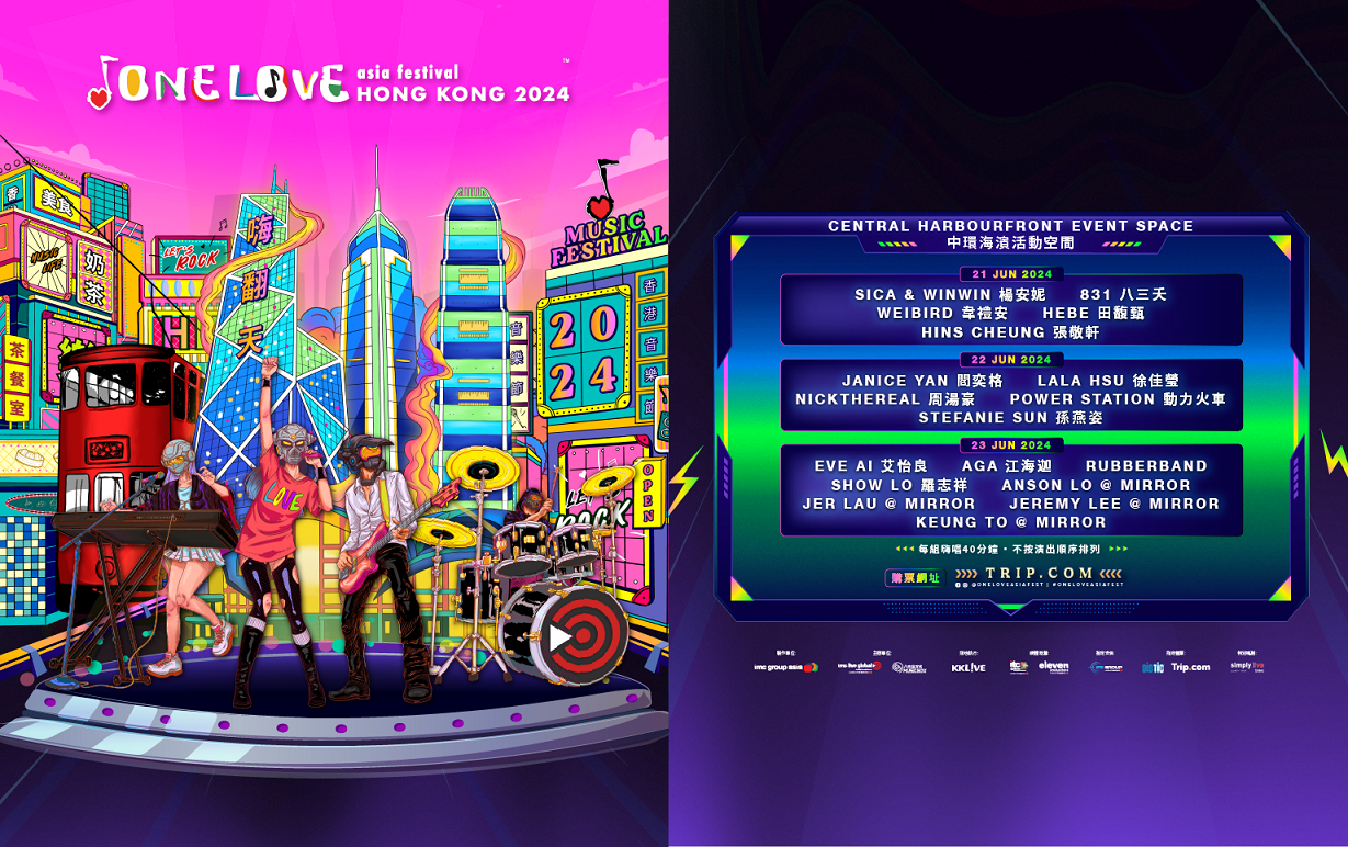 音樂節將於2024年6月21至23日於中環海濱活動空間舉行,將雲集本地和海外歌手,迎來豪華陣容,包括新晉歌手SICA 何洛瑤和WINWIN 楊安妮、搖滾樂團八三夭、音樂才子韋禮安、金曲歌后田馥甄、唱作全才張敬軒、率性女聲閻奕格、金曲歌后徐佳瑩、全能天王周湯豪、搖滾天團動力火車、華語天后孫燕姿、台灣創作歌手艾怡良、香港創作歌手AGA 江海迦、香港流行樂隊RubberBand、亞洲舞王羅志祥以及香港男團MIRROR的4位團員姜濤、盧瀚霆、柳應廷及李駿傑。