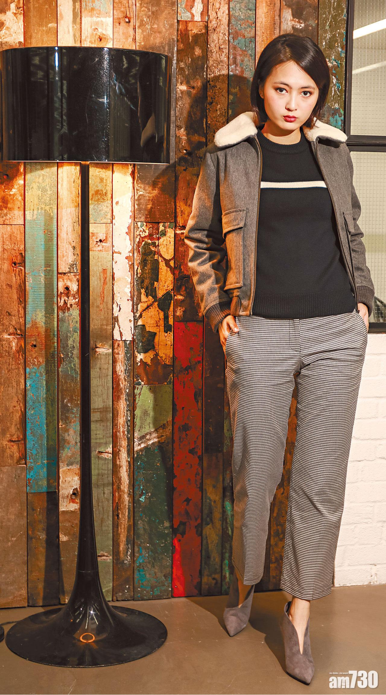 灰色毛領bomber jacket $4,699(A); 黑色白間knit top $2,199(A); 黑白色格仔suit pants $2,499(A); 灰色麖皮high heels $1,899(F)