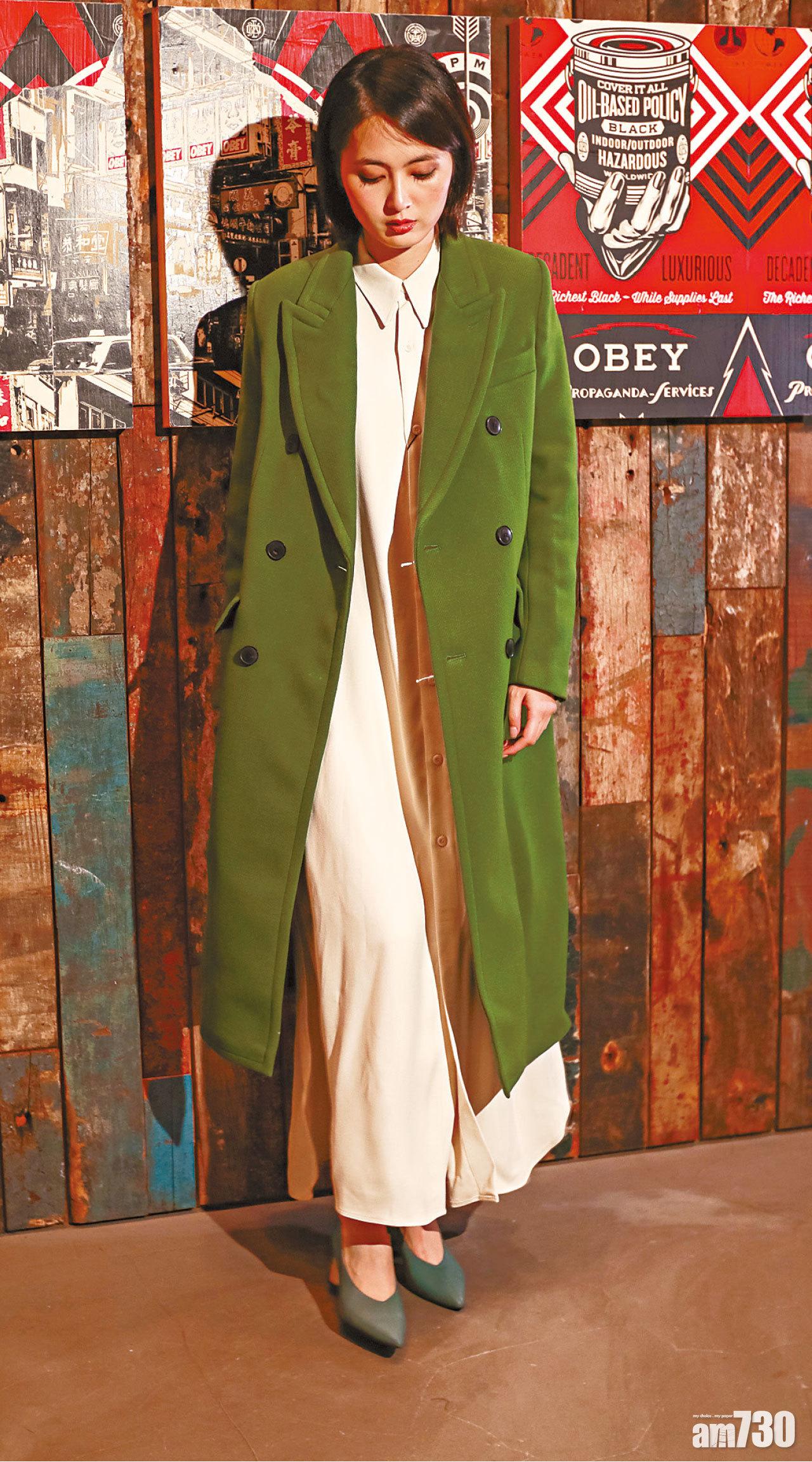 綠色呢絨long pea coat $7,599(B); 白色針織dress shirt $5,699(B); 墨綠色high heels $999(G)