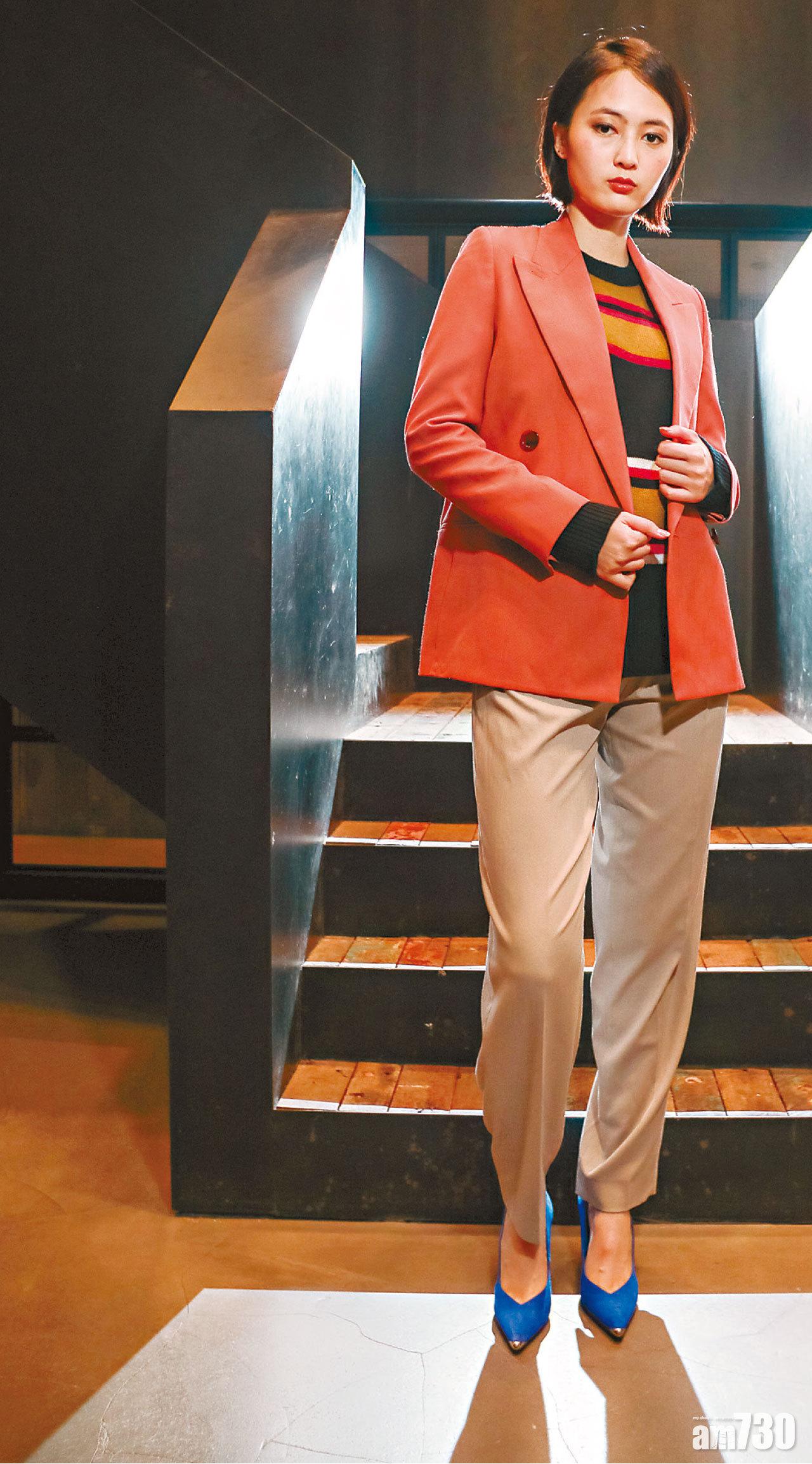 橙色pea coat $5,499(D); 彩色橫間knit top $2,899(D); 灰色suit pants $4,299(D); 藍色麖皮high heels $1,199(F)