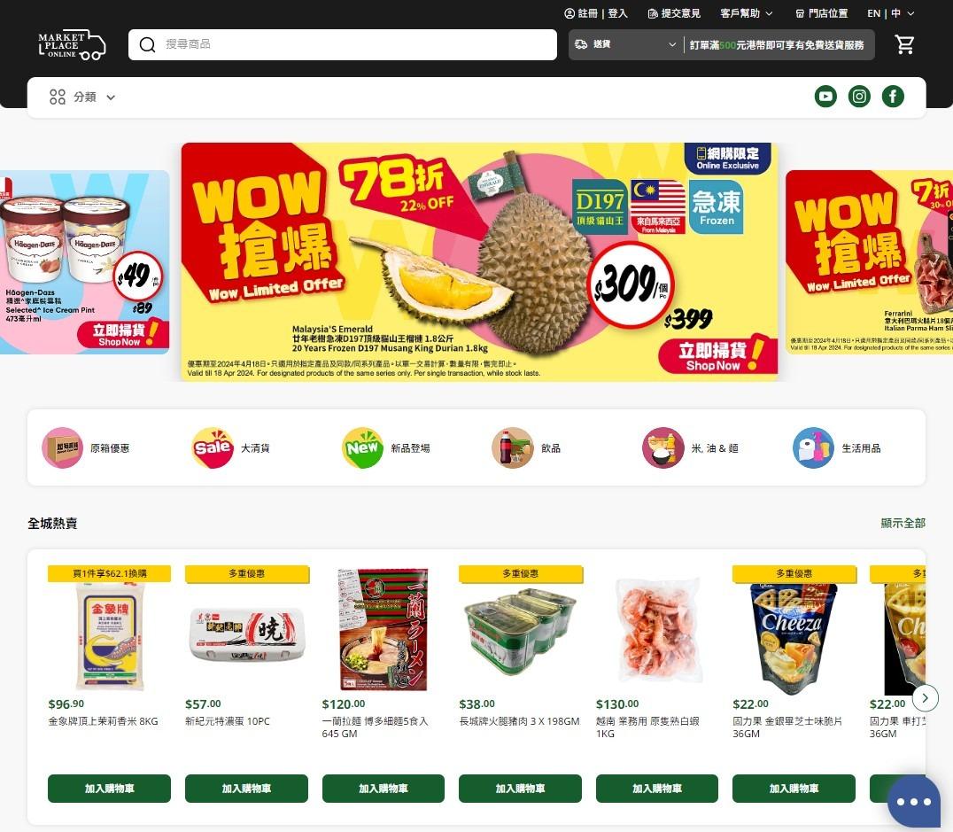 全新Market Place網店為顧客提供更靈活方便的購物方式,貼心地搜羅近10,000種商品,種類包羅萬有,由水果及蔬菜、肉類及海鮮、米、油、麵、乳製品、急凍食品、飲品、酒類,以及個人護理、母嬰用品等。購物滿$500即免費送到府上,輕鬆選購日常用品;顧客買滿$150,更可選擇於Market Place / 惠康 / 3hreesixty 分店自取。