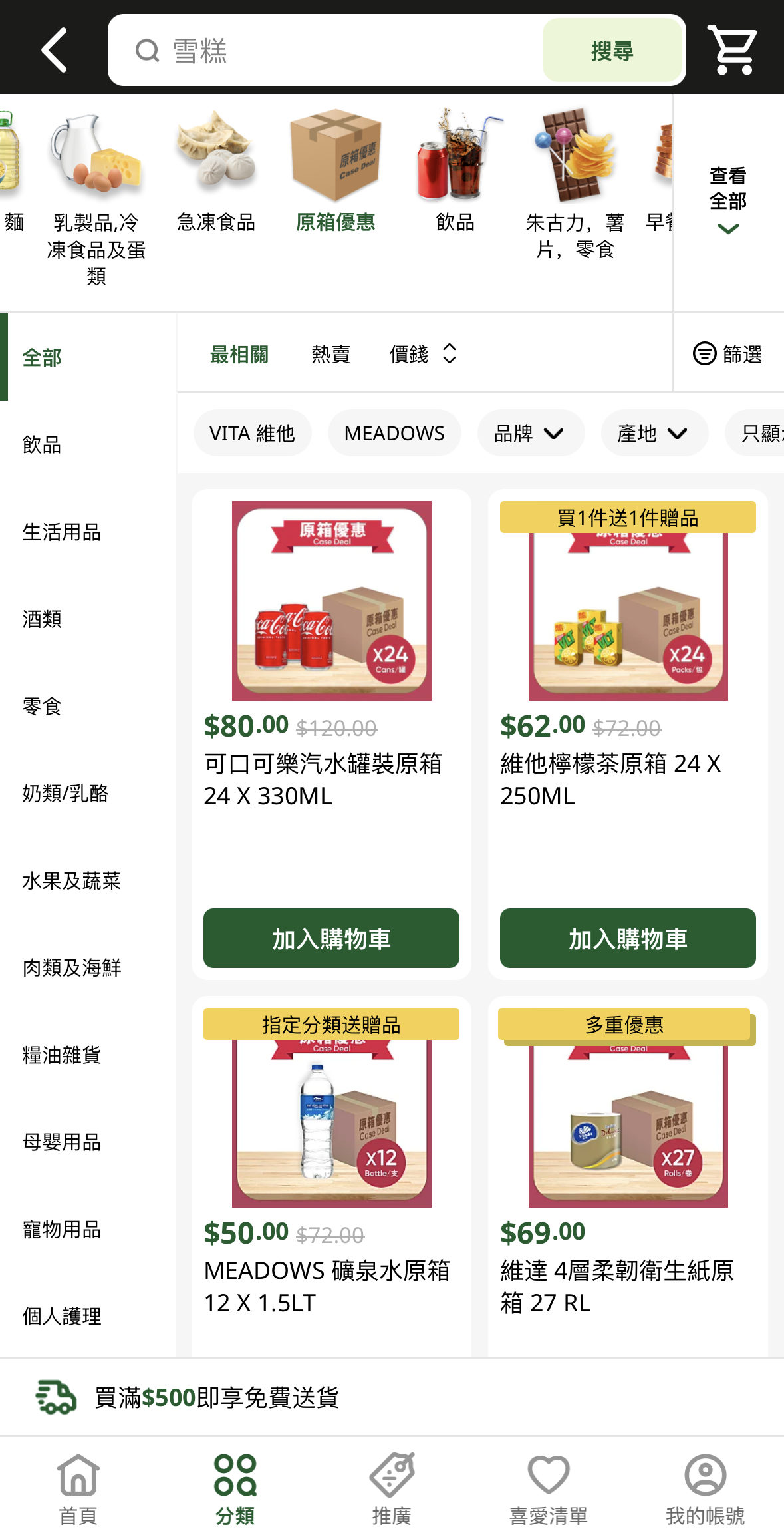 於網店選購紅、白餐酒滿$500即減$80 原箱以低至6折發售,無論汽水、飲品、零食及衞生紙等應有盡有 得寶無香衛生紙 原箱優惠:$89 (75折) 可口可樂 可樂罐裝原箱優惠:$92 (77折) 純甄 原味乳酪飲品原箱優惠:$88 (49折) 嘉頓香蔥薄餅 原箱優惠:$132 (49折)