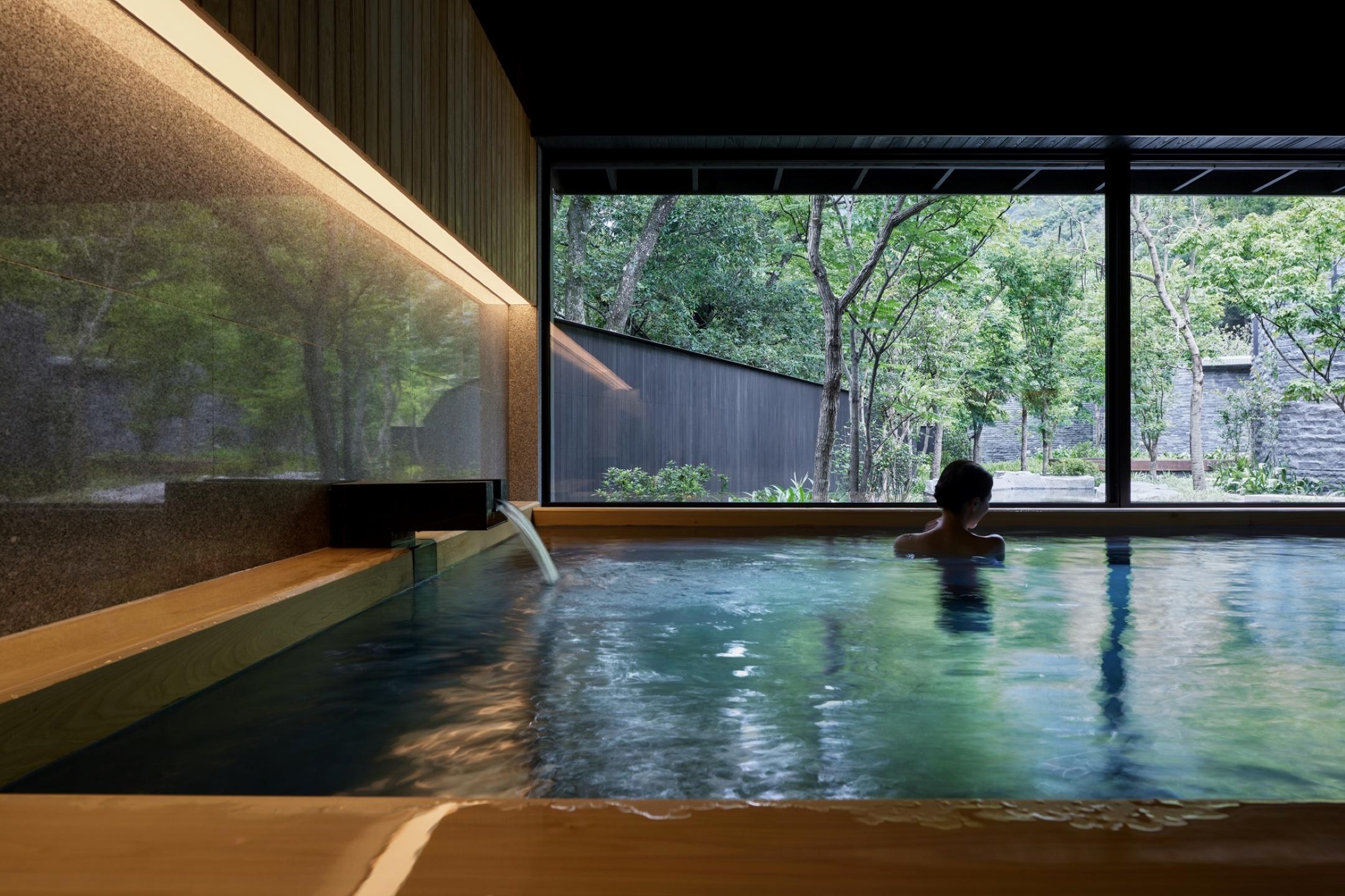 話明是溫泉度假村,最令人期待的一定是日式大眾溫泉浴場!溫泉用來自台灣雪山山脈的谷關溫泉泉水,泉質為碳酸氫鹽泉,有「美肌之湯」的美譽,無色無味,住客可以泡在溫泉中靜靜舒展身心。大眾溫泉浴場分成男女浴場,內分成室內和露天溫泉,結合當地的自然環境,有在森林間浸溫泉的悠閒舒暢感覺。